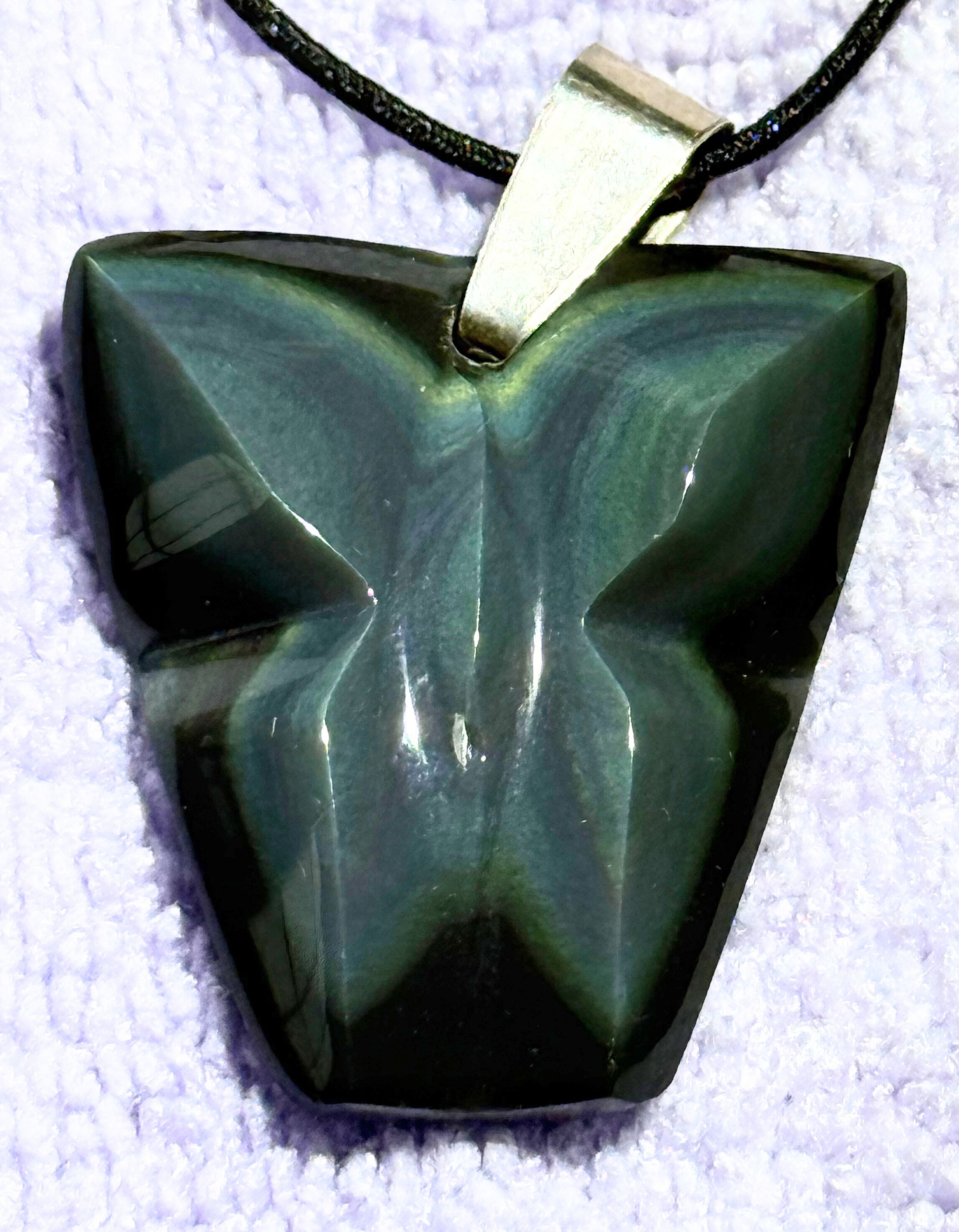This stunning pendant is crafted from genuine Rainbow Obsidian, known for its protective energy and its ability to gently release emotional, physical, and spiritual blockages.