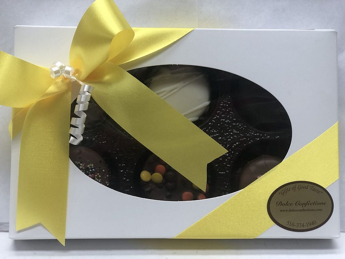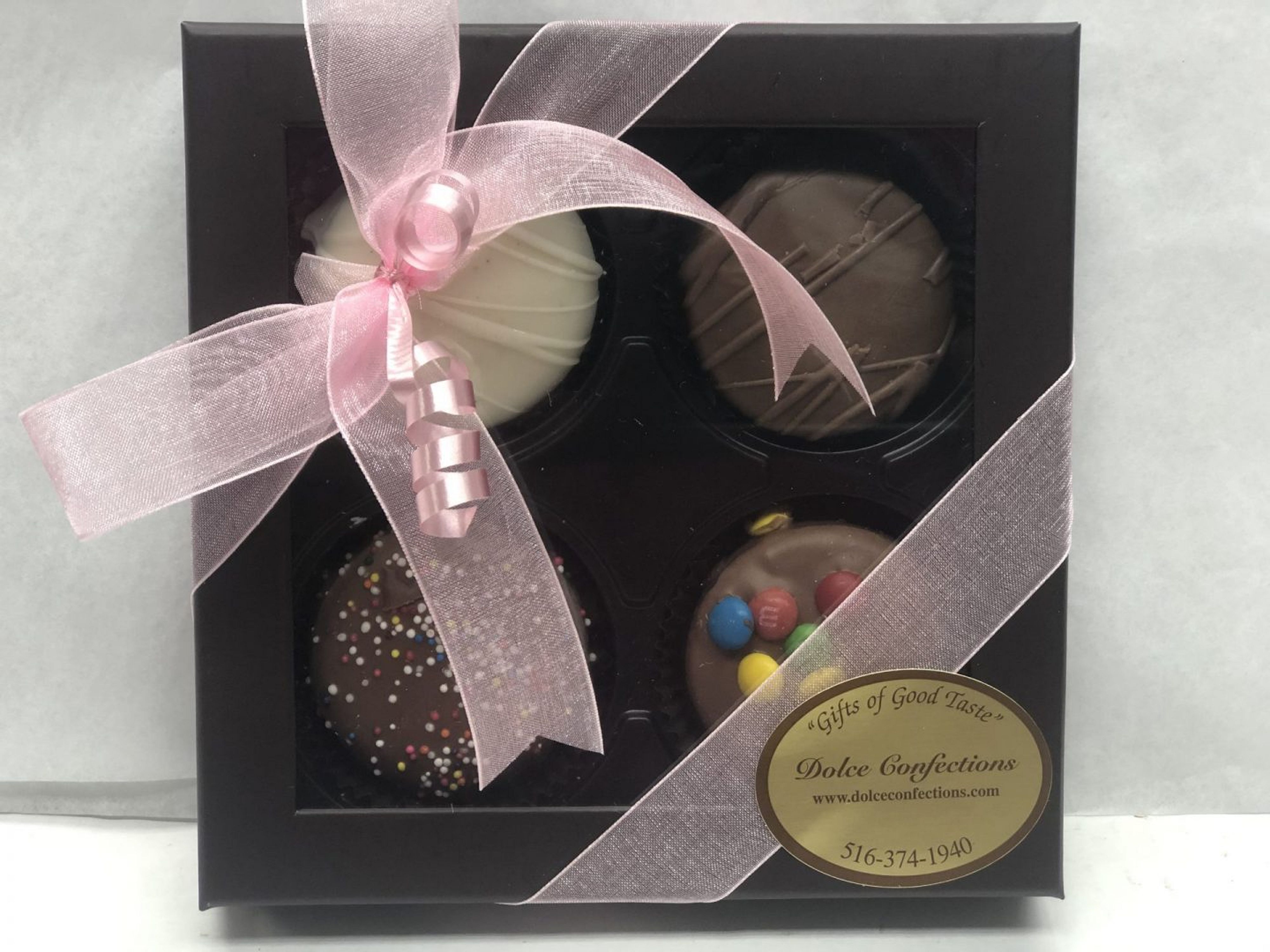 Delicious Oreo cookies hand dipped in milk, dark and white chocolate and covered in candy toppings. Select from 4, 6 or 12 piece boxes.