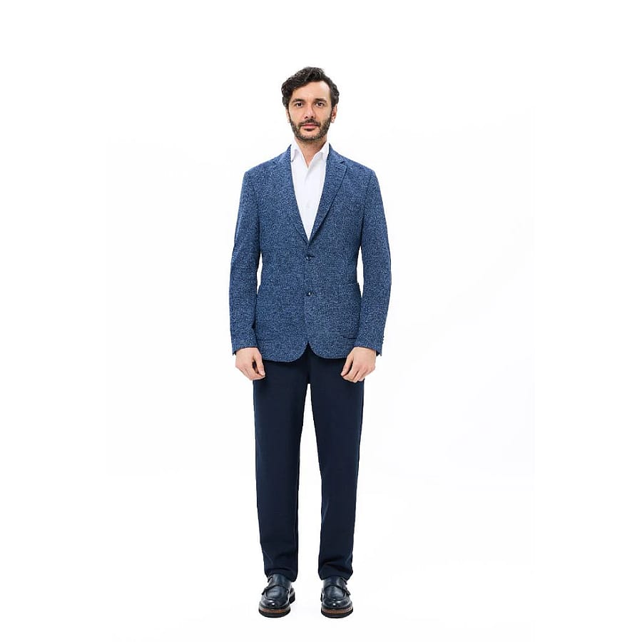 Step into refined style with the double faced dobby crocheted knitted jacket in a rich mélange of indigo and navy blue. Crafted from 65% recycled polyester, 30% viscose, and 5% elastane, this jacket offers a sustainable approach to tailored fashion. its unique textured knit delivers both structure and stretch, providing all-day comfort without sacrificing sophistication. A versatile fall-season essential, it transitions seamlessly from office to evening, pairing effortlessly with dress shirts or casual layers.