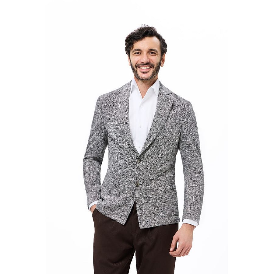 Refined and versatile, this mélange grey double faced knitted stripe jacket is the perfect layering piece for the season. Crafted from a sustainable blend of 65% recycled polyester and 35% viscose, it combines modern tailoring with eco-conscious comfort. The subtle stripe texture and double-faced knit provide structure while maintaining a lightweight, flexible feel. ideal for the fall season, this jacket easily transitions from office meetings to evening outings with effortless sophistication.