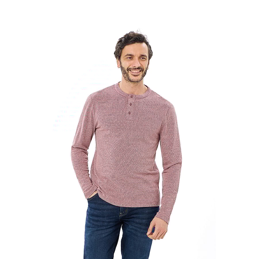 Elevate your casual wardrobe with the henley jacquard bubble dot shirt, designed with a subtle raised dot texture for a modern look. Featuring a 3-button henley neckline with contrast collar piping, this piece strikes the perfect balance between relaxed comfort and refined style. made with a sustainable blend of 50% recycled polyester, 45% organic cotton, and 5% elastane, it delivers softness, stretch, and breathability. perfect for layering or wearing on its own, this versatile henley is a go-to essential for the fall season.