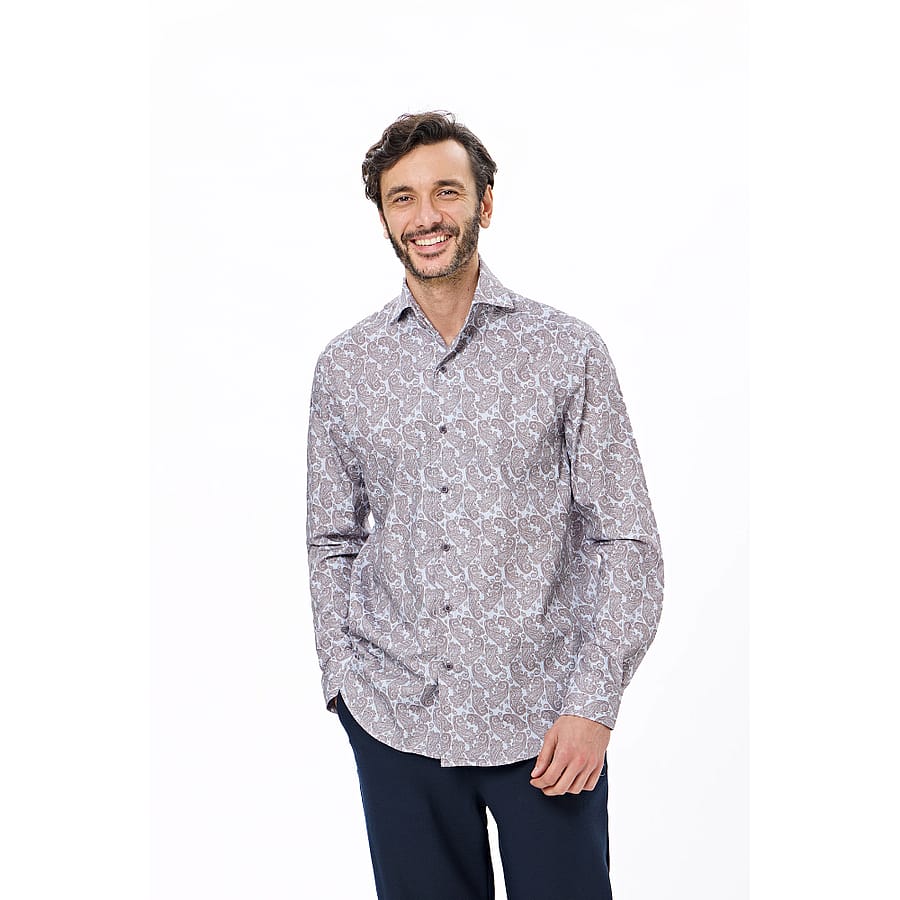 Elevate your style this season with the tan paisley twill herringbone one-piece collar shirt, designed on a refined twill herringbone base. The timeless paisley pattern in warm tan tones offers a sophisticated yet versatile look, making it easy to dress up or wear casually. Crafted from 100% organic cotton, this shirt is breathable, soft, and built for all-day comfort. Featuring a sharp one-piece collar and a classic button-down front, it's the perfect piece to transition effortlessly into the fall season wardrobe.