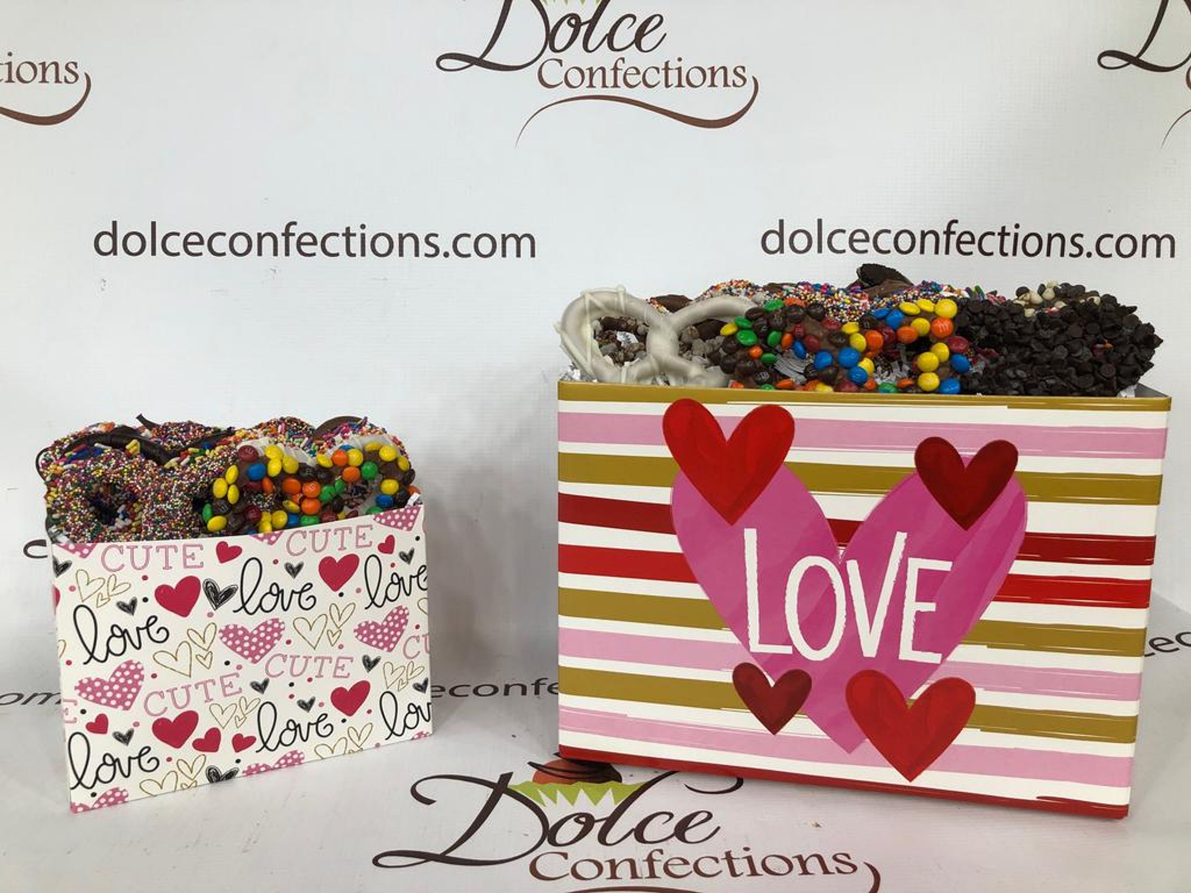 Love totes filled with your favorite chocolate pretzels or candies. Available in small (7” x 4″ x 5″) and large (10″ x 6″ x 7.25″) sizes. #vday26
