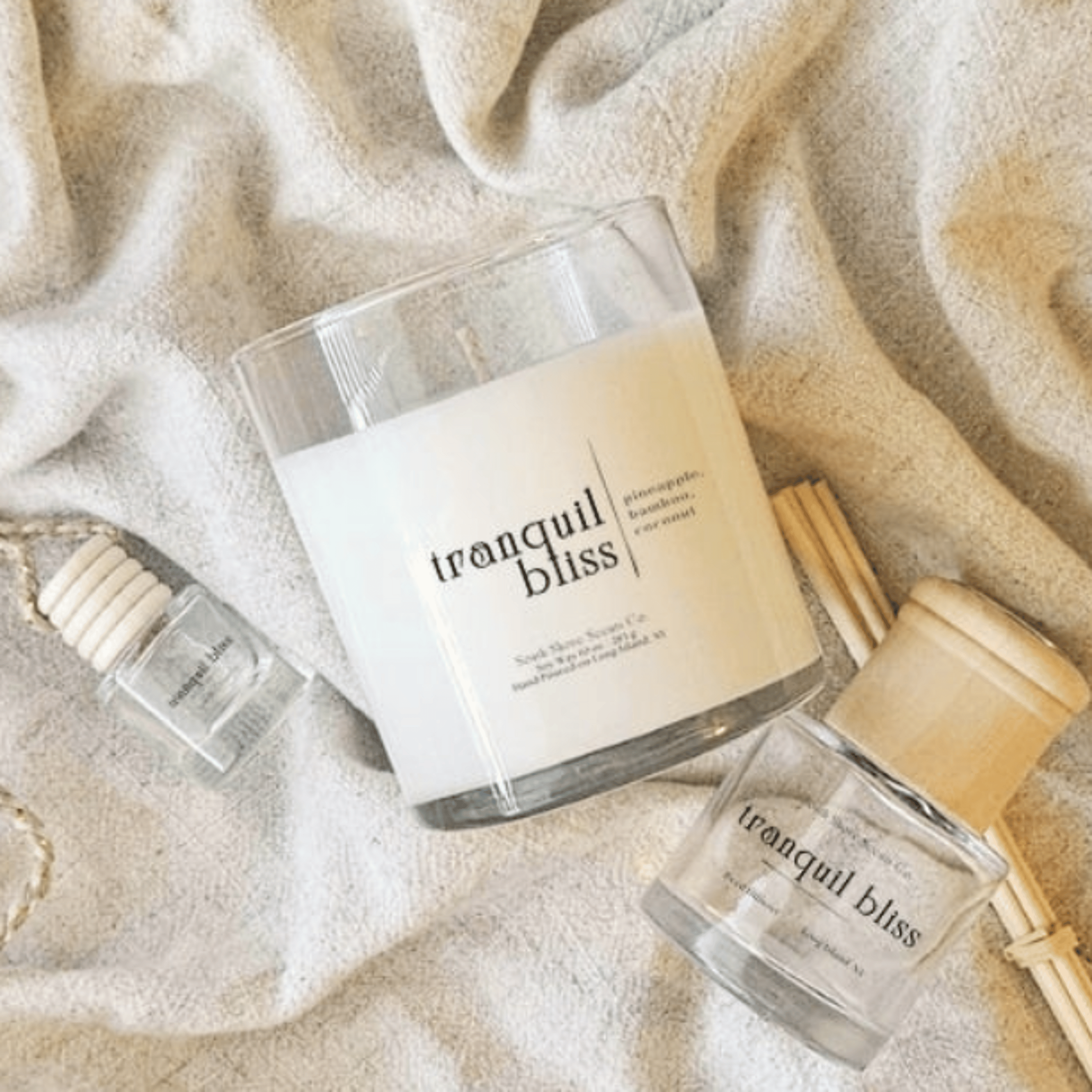 Tranquil Bliss fills your car with a crisp, refreshing blend of spearmint, tropical pineapple, and green bamboo, balanced with creamy coconut for a soft, soothing finish.