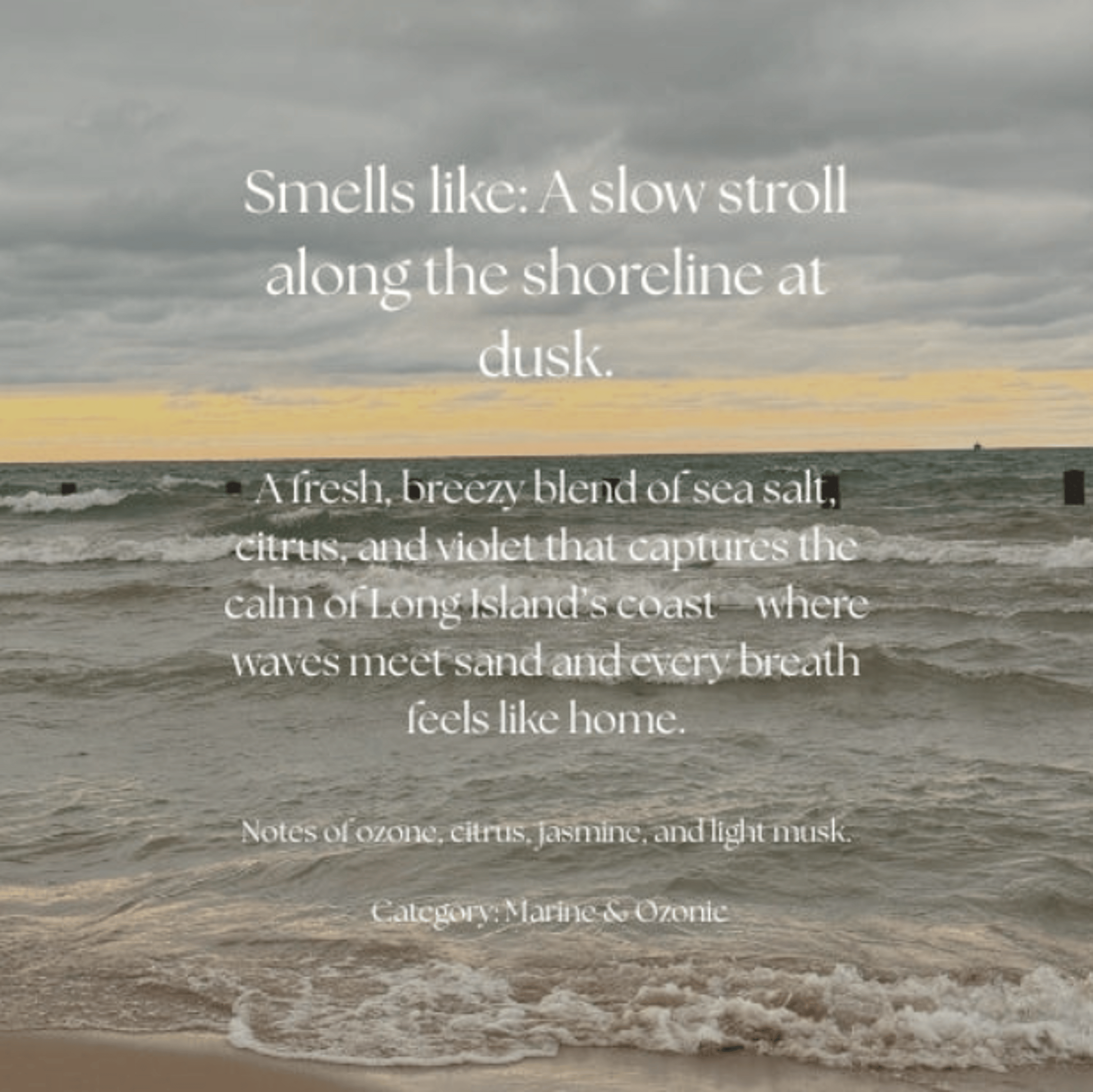 The South Shore captures the refreshing scent of sea salt, ozone, and citrus, softened by florals and grounded with warm cedar.