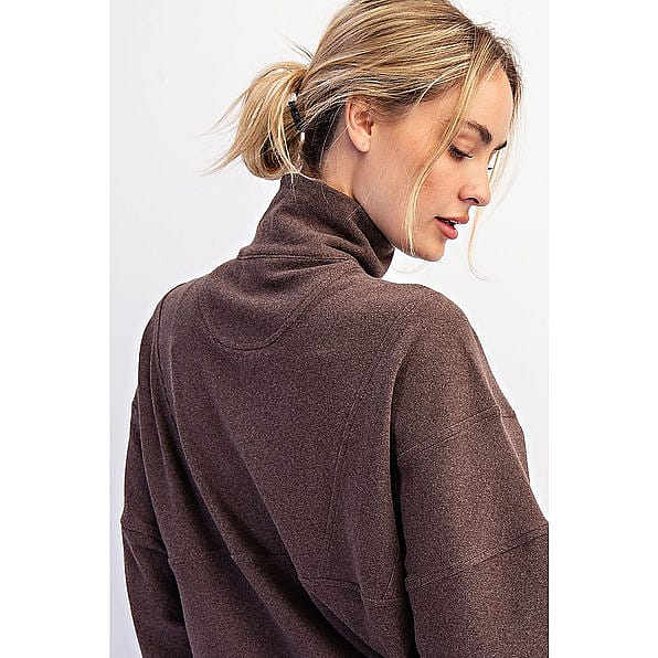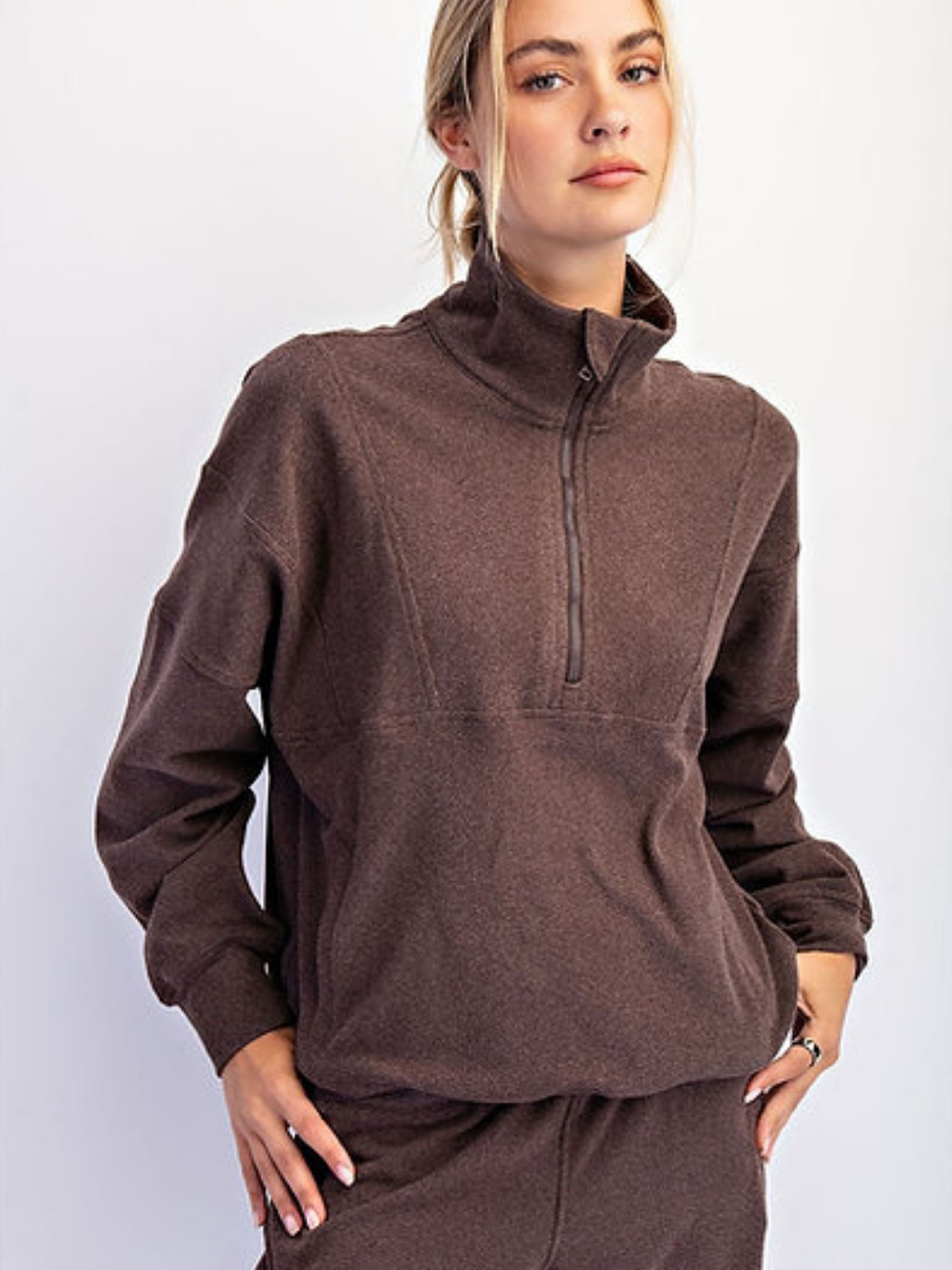 Snuggle up in your new go-to: the Cocoa Cloud Half-Zip. This buttery-soft pullover features a cozy brushed texture, relaxed drop-shoulder fit, and a functional zip neckline perfect for layering. Whether you’re on the go or off the clock, this top brings loungewear luxe to every moment.