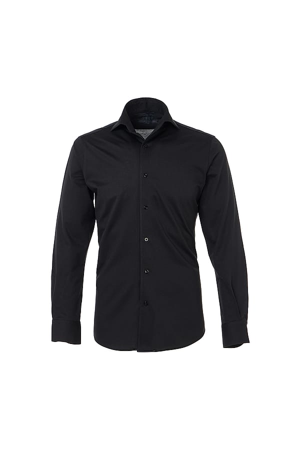 Upgrade your wardrobe with this black one-piece collar shirt, crafted for all-day performance and modern polish. made from a sustainable blend of 60% organic cotton and 40% recycled polyester, it features 6-way stretch for unmatched comfort and movement. Designed with moisture-wicking, non-iron, and quick air-dry technology, this shirt keeps you looking sharp with minimal effort. The sleek one-piece collar adds a refined touch, making it versatile enough for both work and evening wear. A must-have fall season essential that blends sustainability, performance, and timeless style.