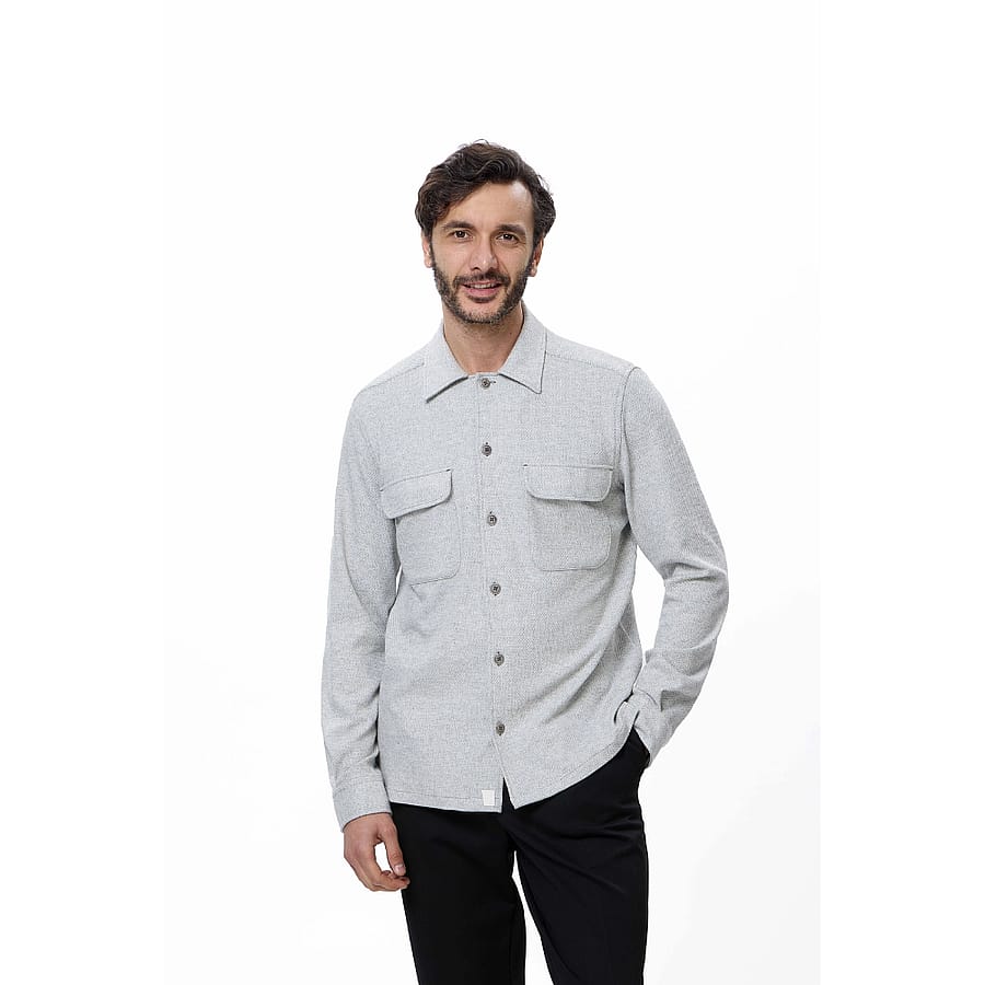 Stay sharp and comfortable in this grey dobby double-faced knit shirt jacket, designed with versatility in mind. made from a sustainable blend of 65% recycled polyester, 30% viscose, and 5% elastane, it offers a soft yet durable finish with just the right amount of stretch. Featuring two button-flap chest pockets, a full button-down front, and clean tailoring, this piece works effortlessly as both a shirt and a lightweight jacket. A perfect layering essential for the fall season, combining modern style with everyday ease.