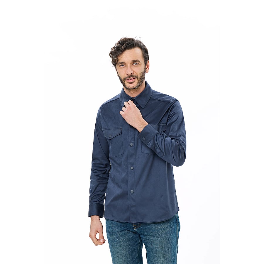 Elevate your cool-weather style with this indigo faux suede shirt jacket, crafted from a sustainable blend of 90% recycled polyester and 10% elastane. The double-faced fabric gives it a rich, velvety feel inside and out, while added stretch ensures all-day comfort. Designed with piping details and a button-down front, this versatile piece can be worn as a shirt or layered as a lightweight jacket. perfect for the fall season, it's a refined choice for both casual outings and dressed-up evenings.