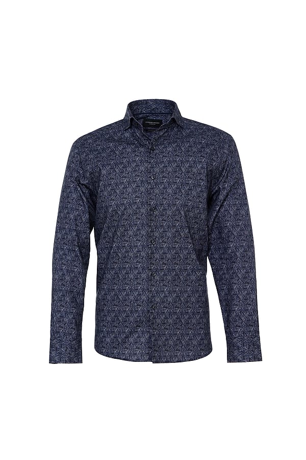 Elevate your fall wardrobe with the chain geo print shirt, designed with a sophisticated navy and taupe all-over print. Crafted from 100% organic cotton with a luxurious cashmere touch finish, this shirt offers both softness and style. Dark navy piping accents at the inner collar, inner cuff, and side slit add a refined detail, making it a versatile choice for both professional and casual looks. A button-down essential that delivers comfort, sustainability, and timeless appeal.
