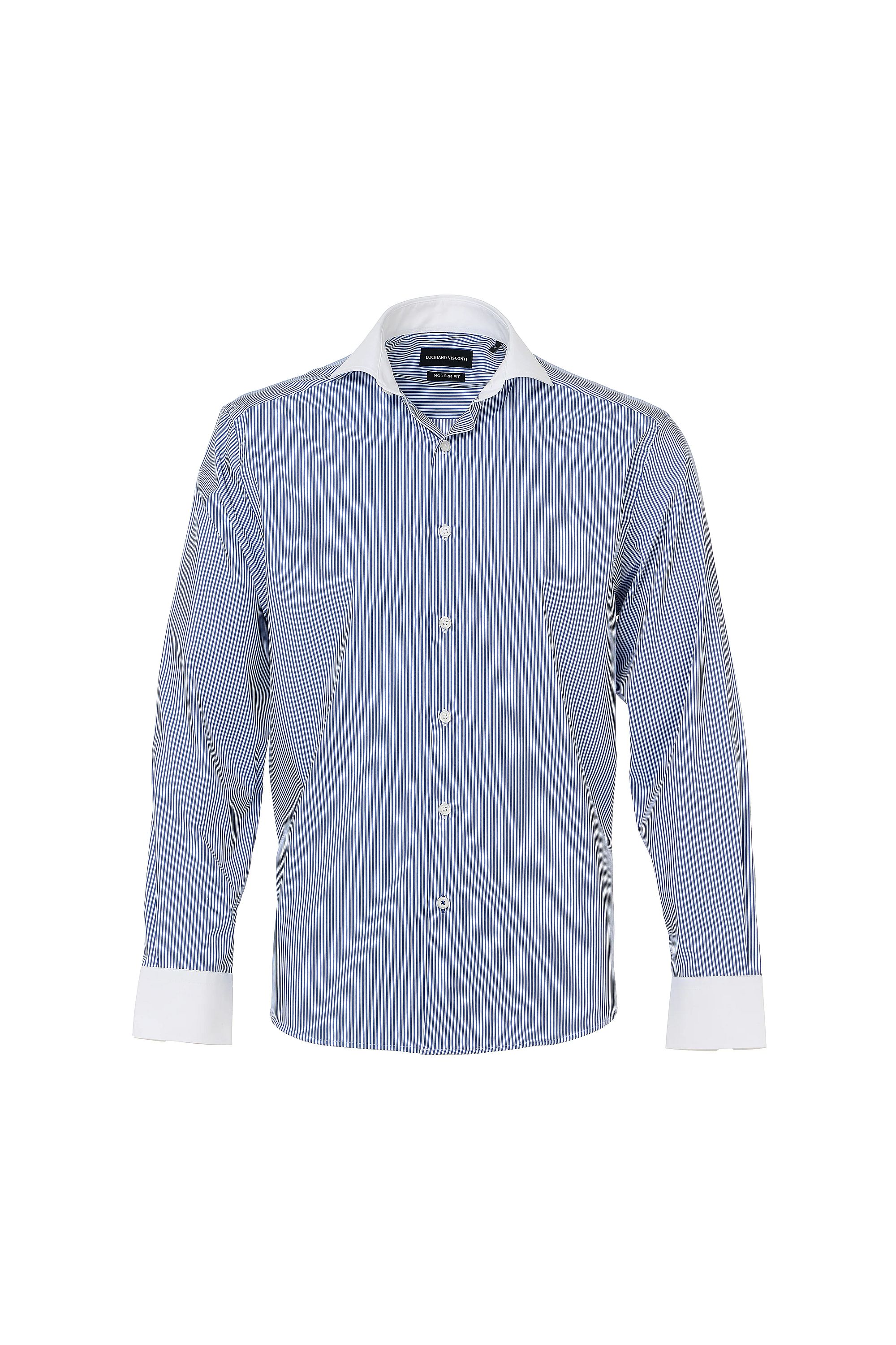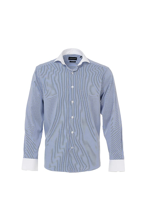 Classic stripes with a modern edge—our navy and white awning stripe shirt is designed with a crisp white contrast collar and cuffs for a refined finish. made from 97% recycled polyester and 3% elastane, this shirt offers a sustainable, wrinkle-resistant fit with comfortable stretch. The tailored button-down style makes it versatile for both office wear and evening outings, while the bold stripe pattern adds timeless appeal. A fall season essential that blends polish with ease.