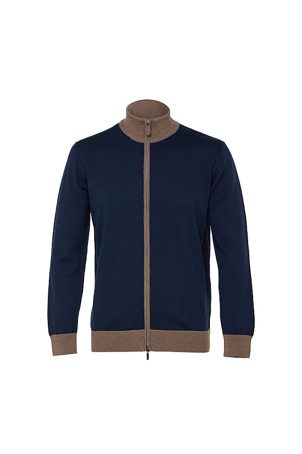 Stay sharp and comfortable this fall with our double full zip sweater, designed with clean lines and subtle contrast detailing. Featuring contrast piping at the collar, cuffs, and hem along with a refined front piping accent, this sweater delivers a polished yet versatile look. Crafted from a sustainable blend of 70% organic cotton and 30% recycled acrylic, it offers lightweight warmth, softness, and durability. The double full zip design makes it easy to layer over shirts or tees, making it a go-to essential for both casual and elevated outfits.