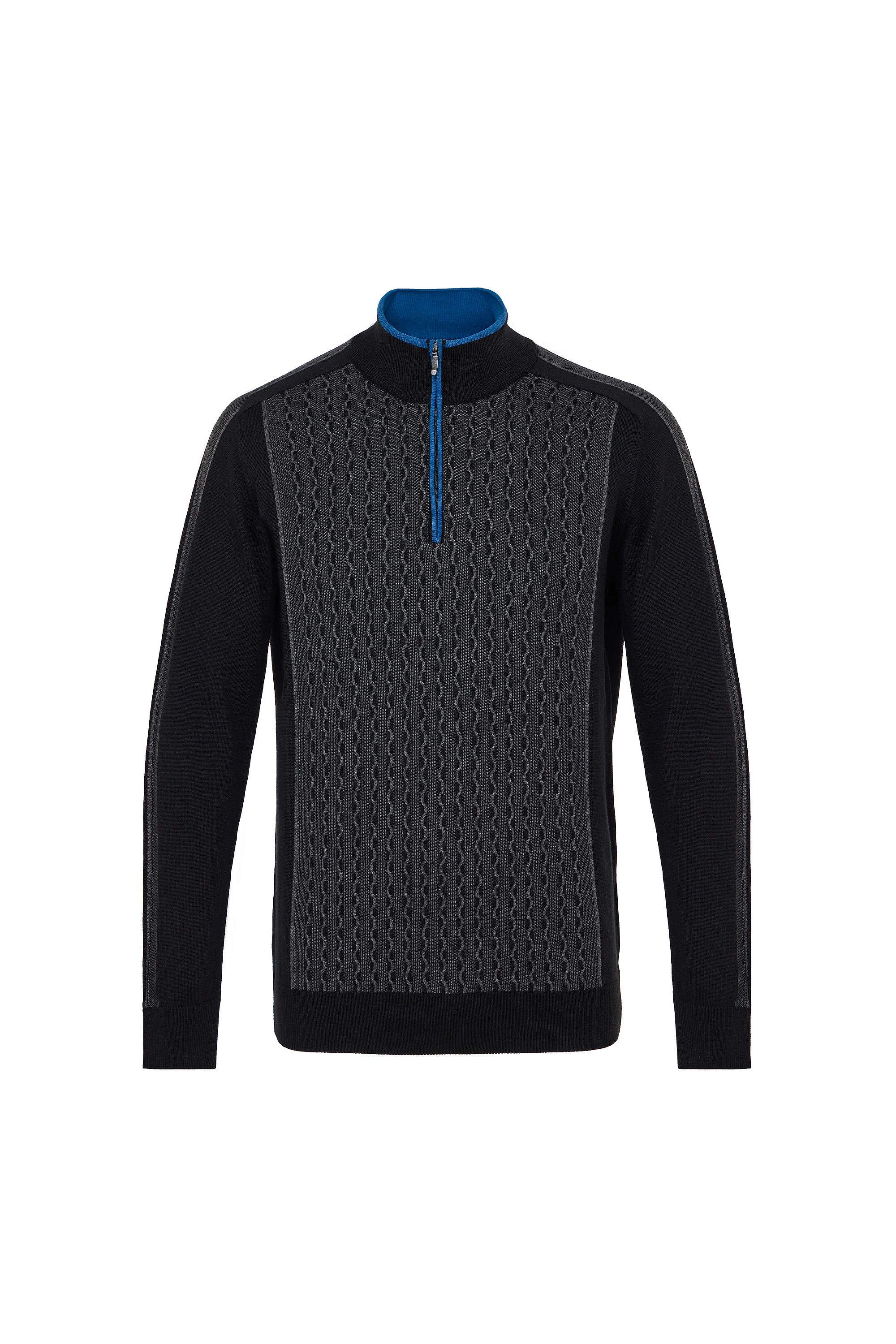 Stand out in style with our quarter zip panelled wave jacquard sweater, designed with a bold textured wave pattern across the front for a modern edge. Crafted from 70% organic cotton and 30% recycled acrylic, it offers eco-friendly comfort with lasting durability. The contrasting blue quarter zip and panel detailing give this sweater a sleek, athletic-inspired look that transitions effortlessly from casual weekends to smart evenings out. A versatile fall essential built for both comfort and style.