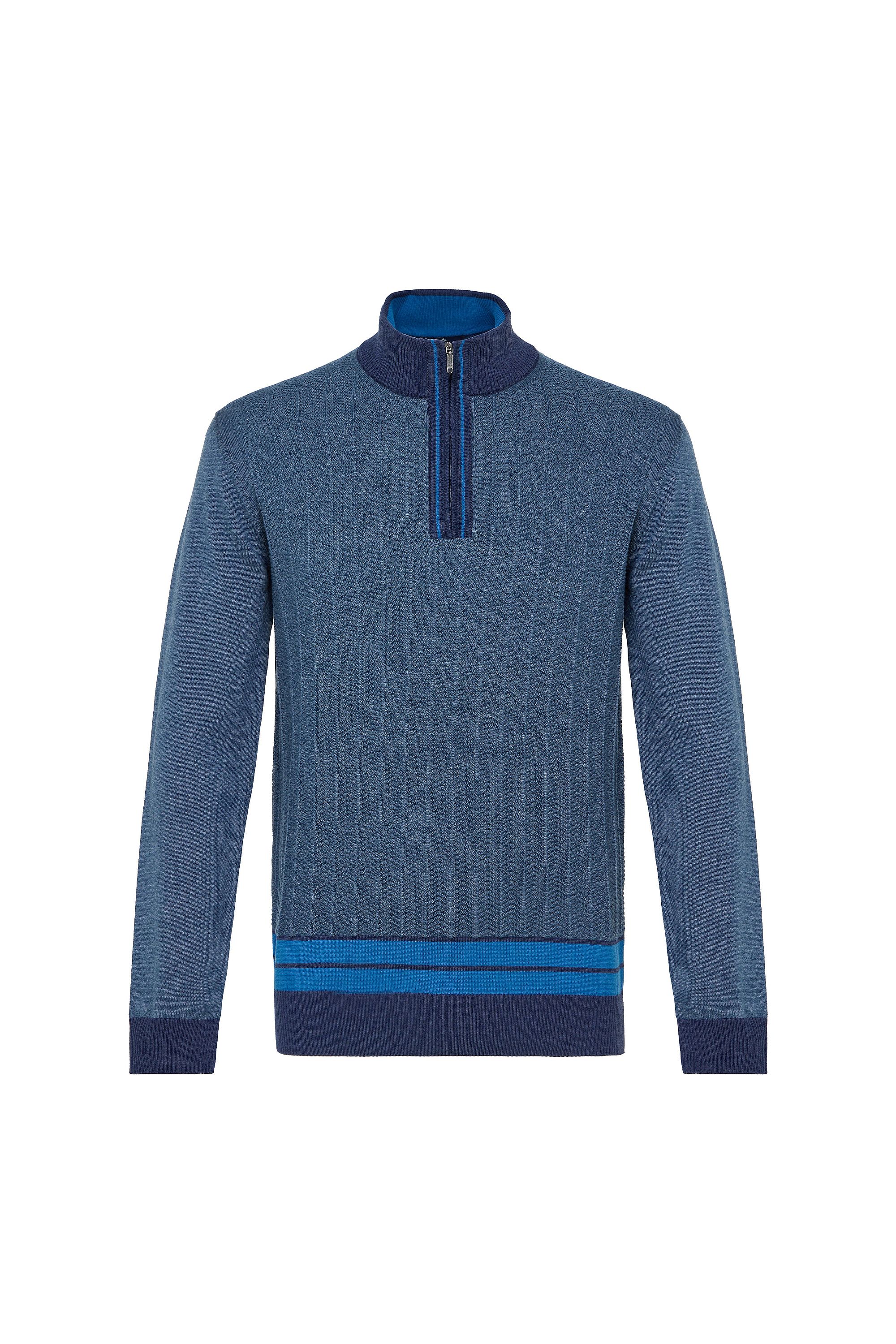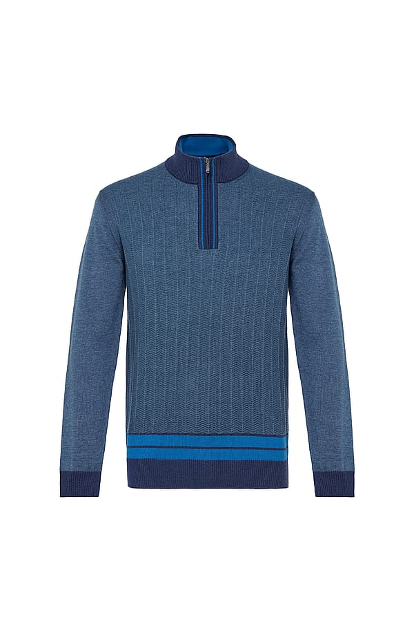 Classic design meets modern detailing in our quarter zip chevron sweater. Crafted from a sustainable blend of 70% organic cotton and 30% recycled acrylic, this sweater offers lightweight warmth and all-day comfort. The chevron knit adds subtle texture, while the contrast piping, collar, and cuff details elevate the look with refined style. Featuring a versatile quarter zip neckline, it's perfect for layering over a shirt or wearing on its own during the fall season. A smart essential that transitions effortlessly from weekday polish to weekend ease.
