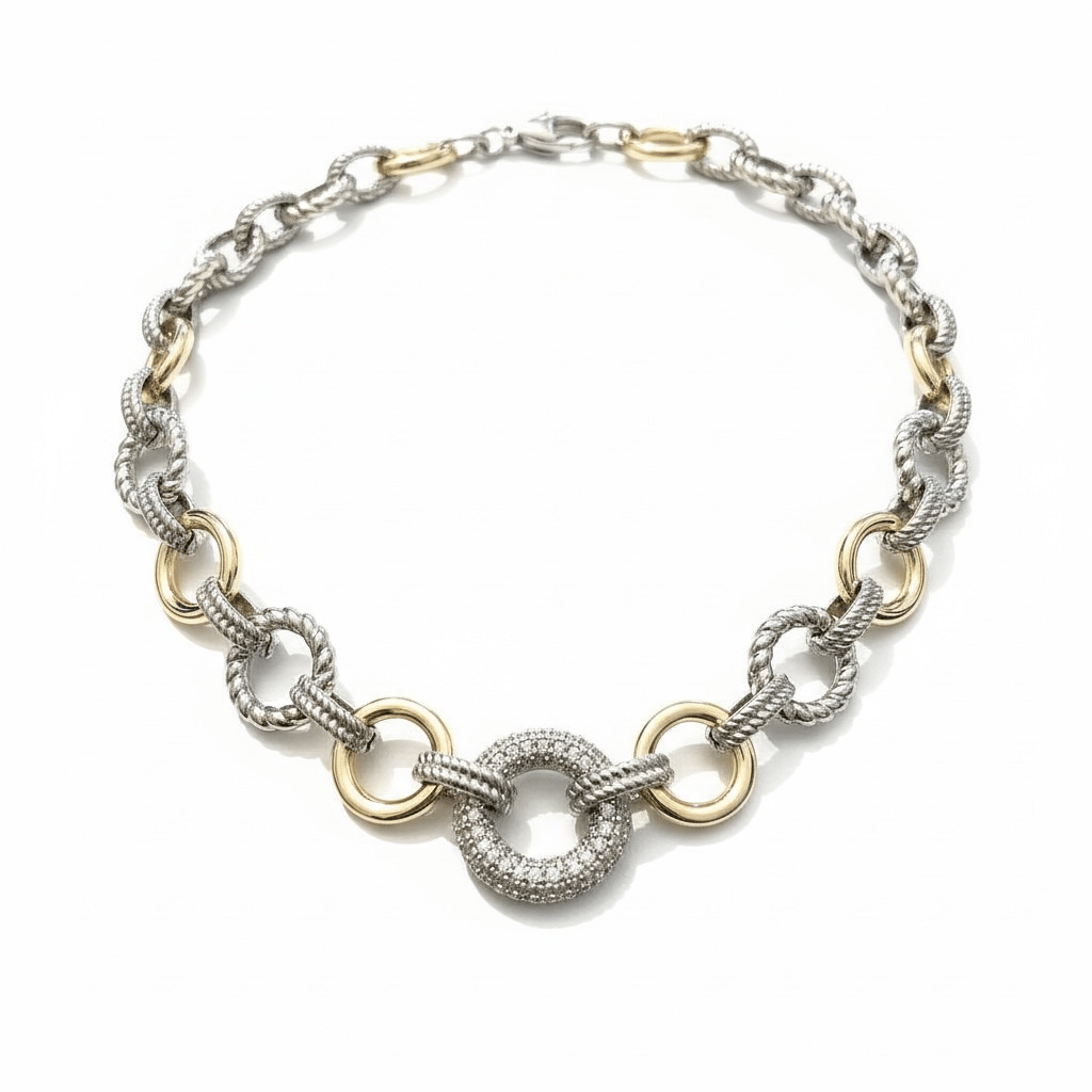 Add this to your personal collection or gift it for the holidays. Multi colored link necklace accented with a central pave (faux) diamond center. 18” adjustable