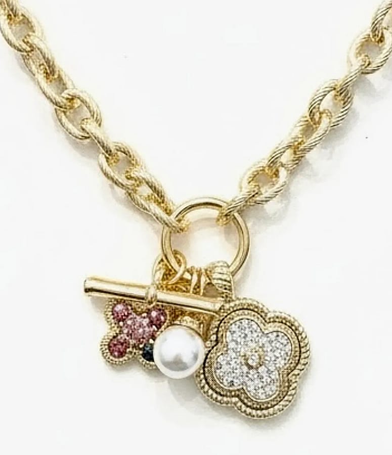 This is a beautiful fashion forward necklace features a pave faux diamond, pearl, toggle and multi colored stone charms.