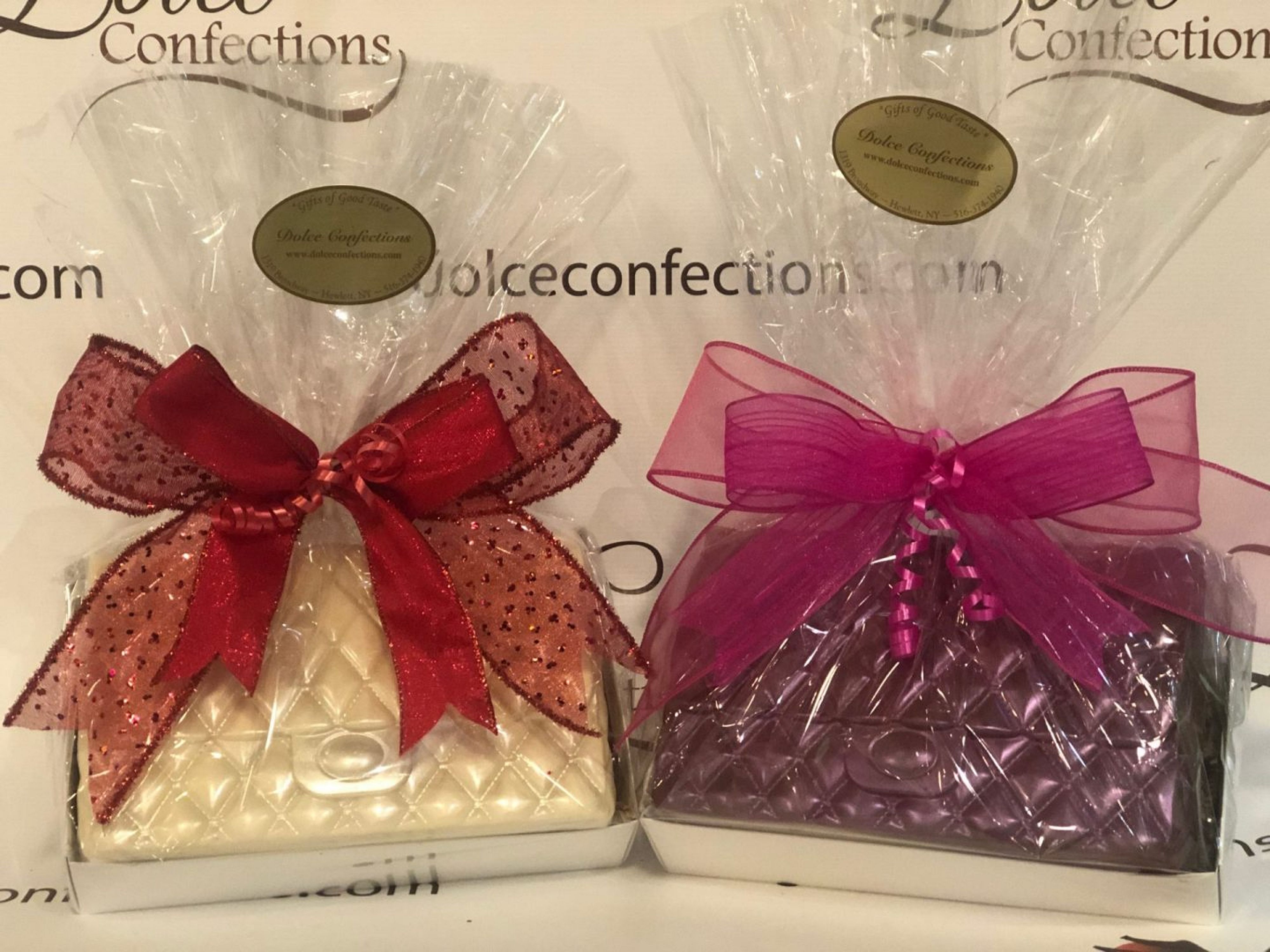 The perfect gift for bachelorette parties, these 3D chocolate purses come in small (measuring 5″ x 4 3/4″) and large (measuring 8″ x 5 1/2″). Writing can also be added. Please specify desired message in the notes at checkout.