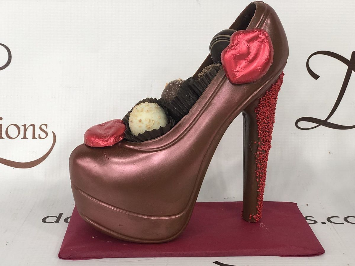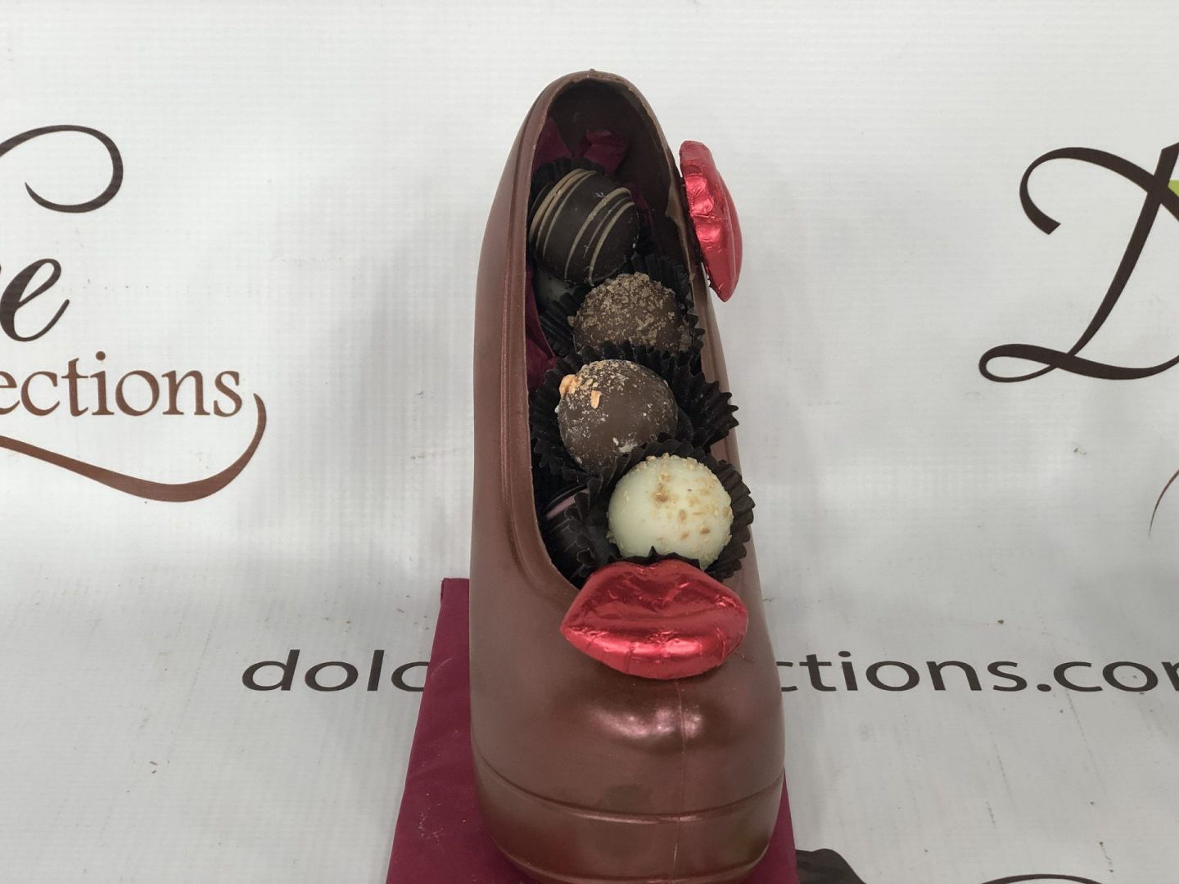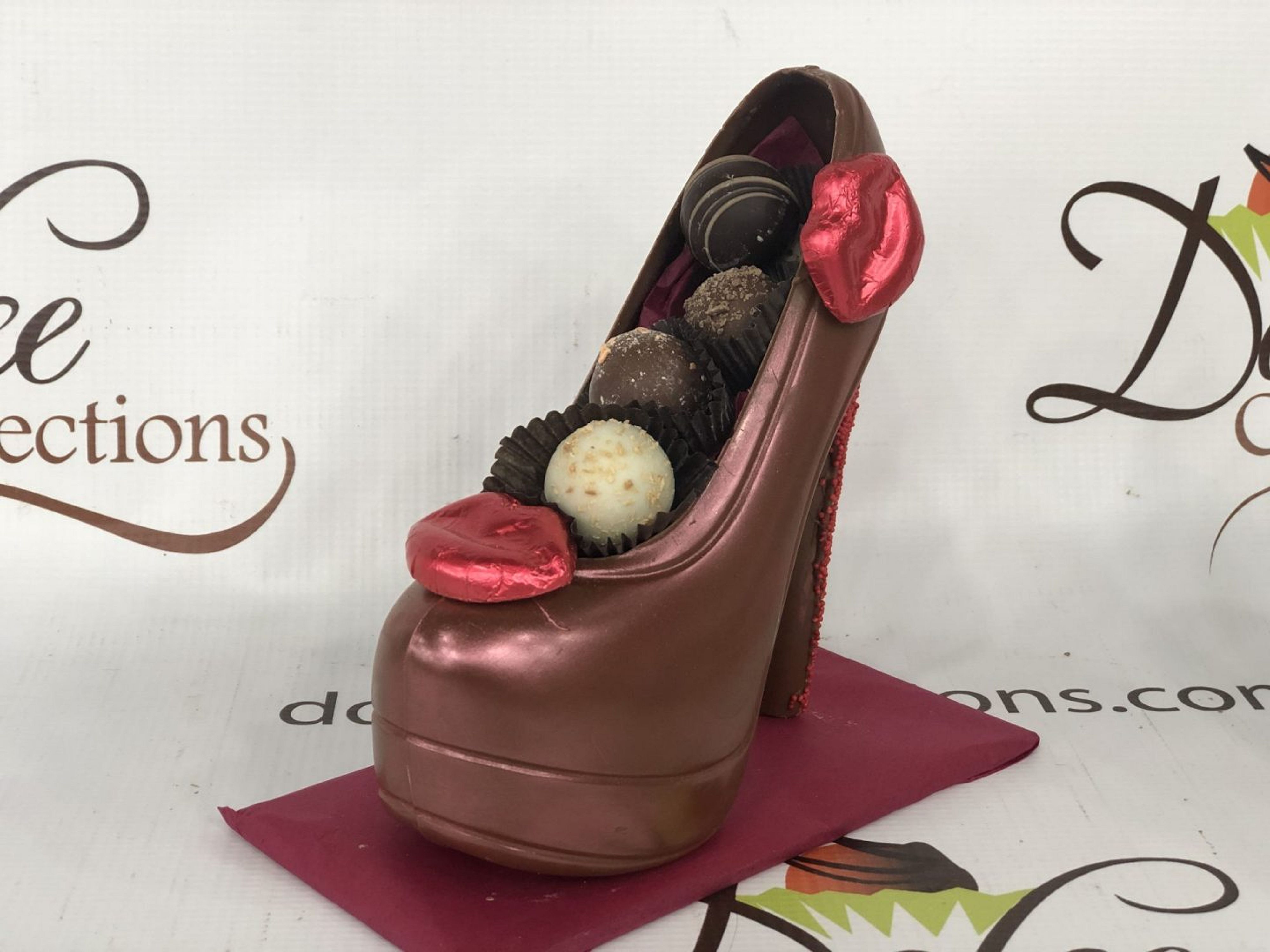 Platform high heels measuring approximately 7″ long x 2 1/2 ” wide x 6 1/2″ tall with a 5″ heel decorated in red dust and filled with approximately .25 lbs. of chocolate truffles. Available in milk or dark chocolate. #forthefoodieli