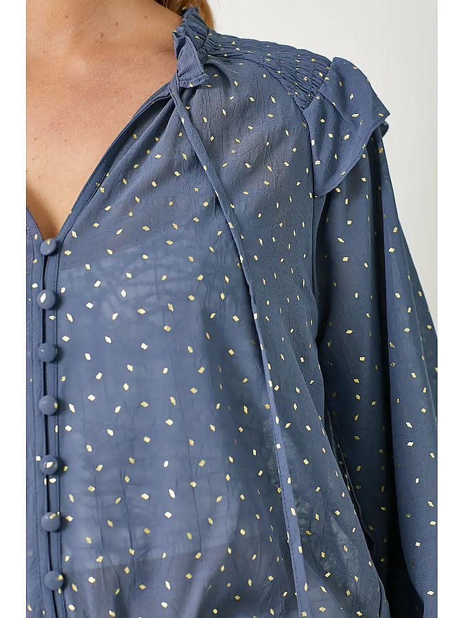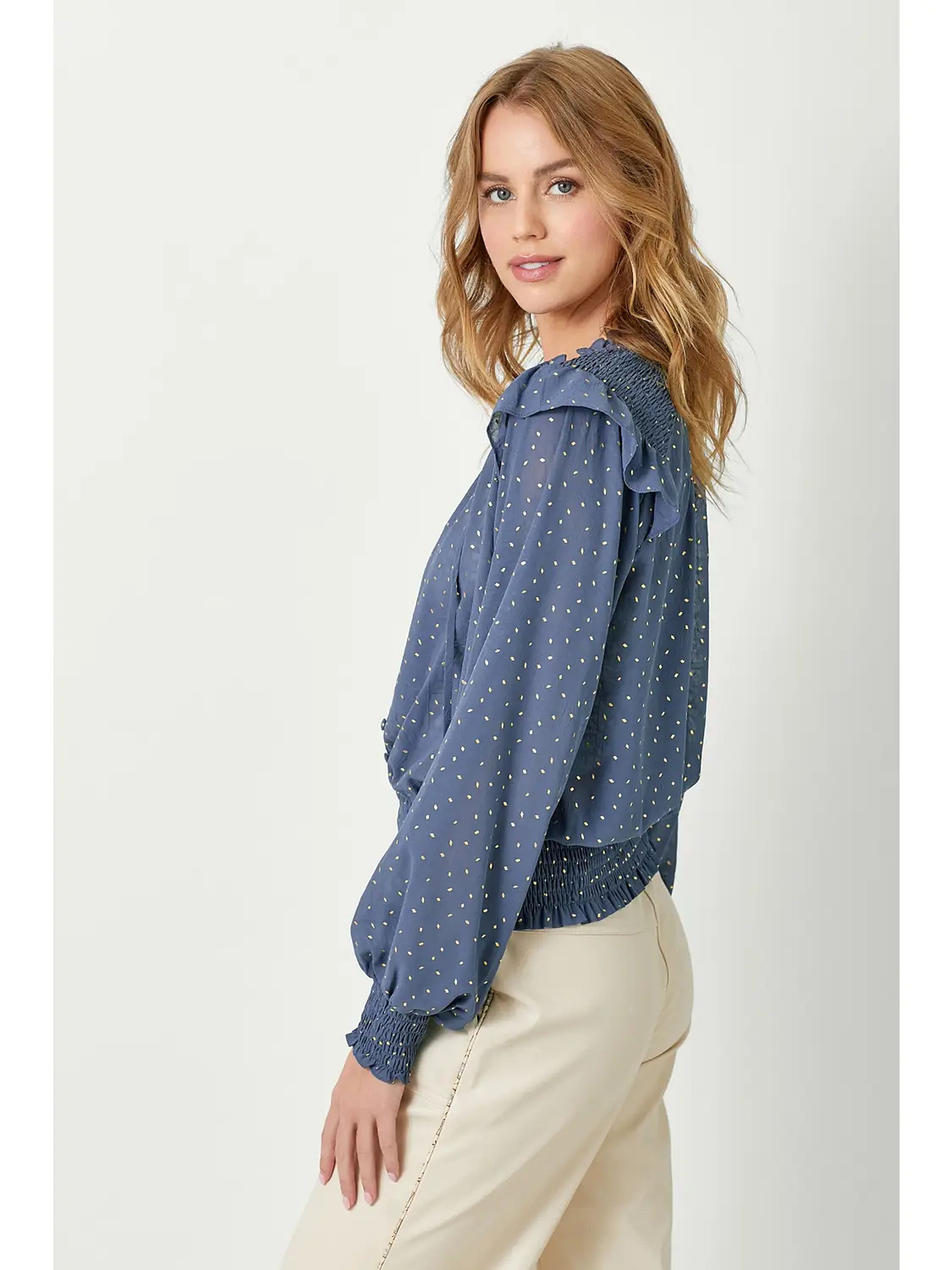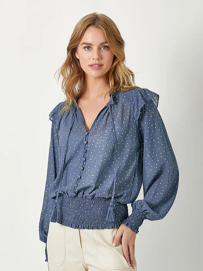 This dreamy deep blue blouse brings soft romance and subtle charm to your fall wardrobe. The Blue Moon Smocked Blouse features delicate gold dot accents, fluttery ruffle shoulders, and a flattering smocked hemline that gives it a polished, feminine shape. Whether you're heading to dinner, drinks, or date night, this blouse is an instant standout.