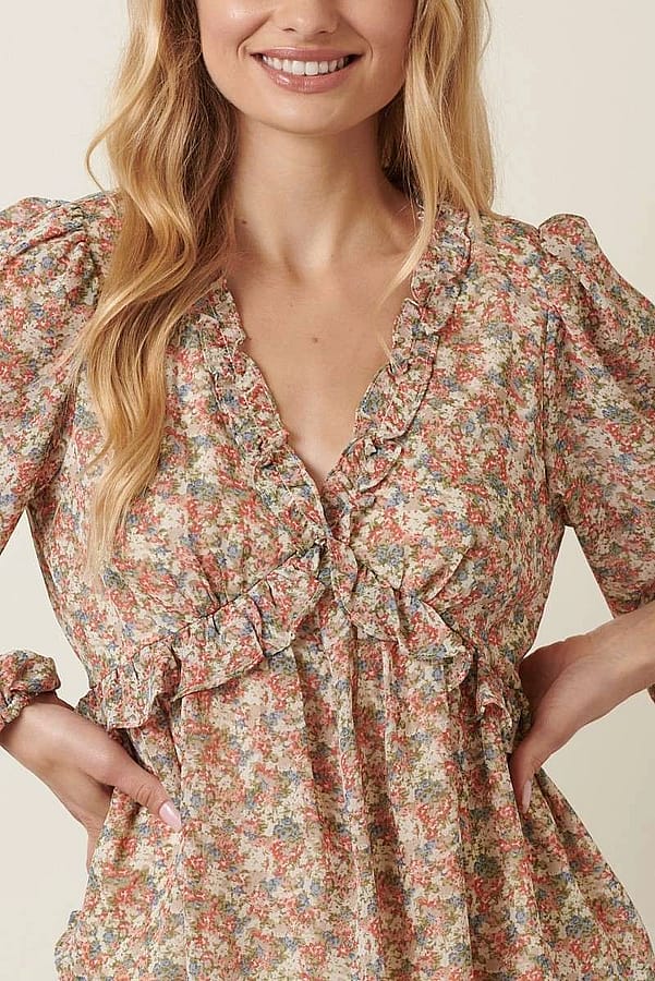 Flattering V-neckline with ruffle detail
