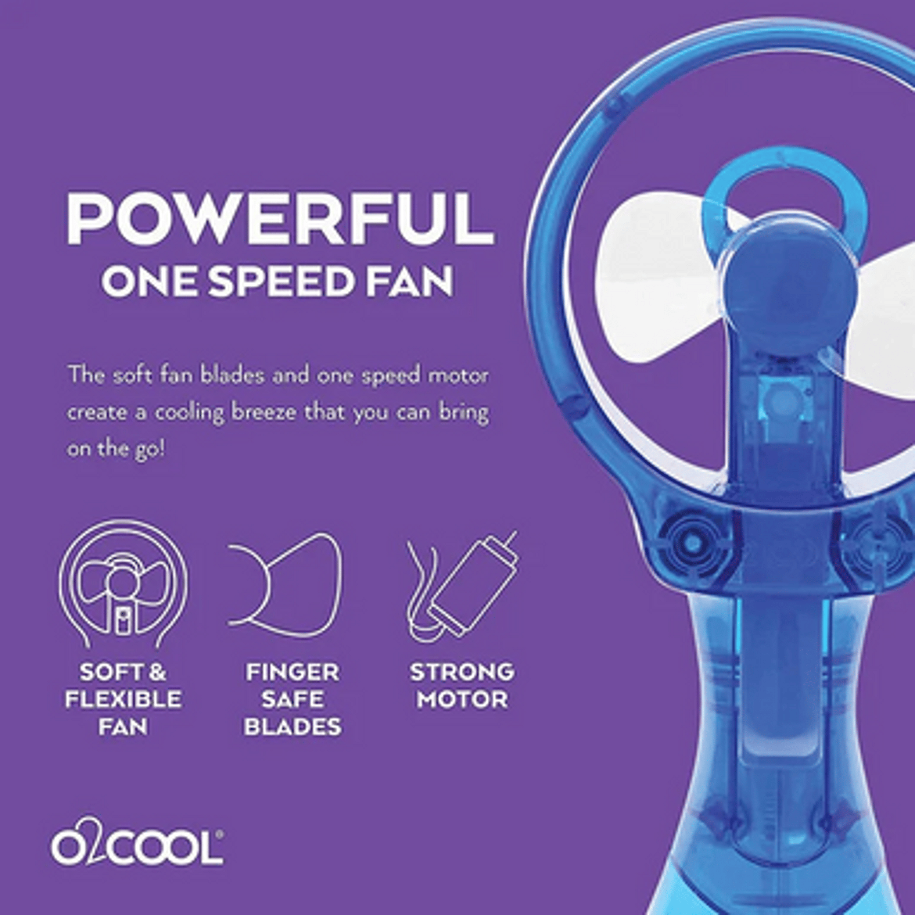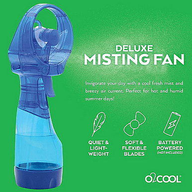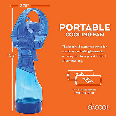 Stay cool anytime, anywhere with the O2COOL Deluxe Misting Fan your portable solution for instant relief on hot days. Combining a powerful personal fan with a refreshing water mist, this handheld essential delivers a double dose of cooling comfort whether you re on the field, in the stands, or at the beach. Its ergonomic design features a soft-grip handle, thumb-activated fan switch, and a wide-mouth opening for easy refills. Perfect for athletes, outdoor workers, and spectators alike, the O2COOL Misting Fan is a game-day lifesaver and summer staple. Features 2-in-1 Cooling : Combines fan and mist for extra refreshment. Thumb-Activated Fan : Easy to operate with one hand. Soft-Grip Handle : Comfortable for long use. Wide-Mouth Bottle Opening : Quick and easy to fill with water and ice. Battery Operated : Uses 2 AA batteries (not included). Durable Design : Made for active use in hot environments.