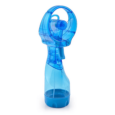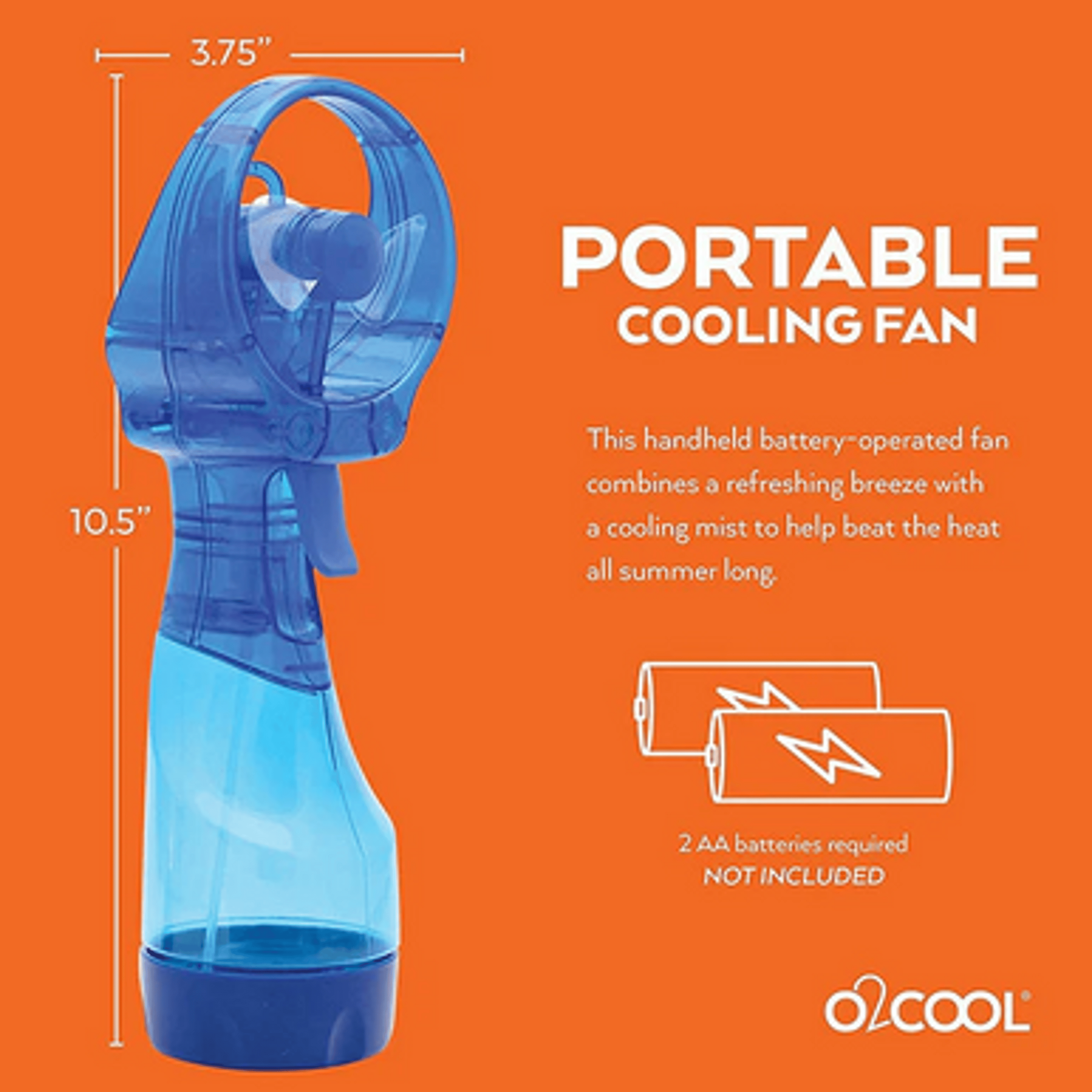 O2COOL. Model : Deluxe Misting Fan. Power Source : 2 AA Batteries (not included). Dimensions : Approx. 10. 5" H x 3. 5" W. Materials : Plastic with soft-grip handle. Weight : Lightweight and portable. Usage : Outdoor, Sports, Recreation, Travel.