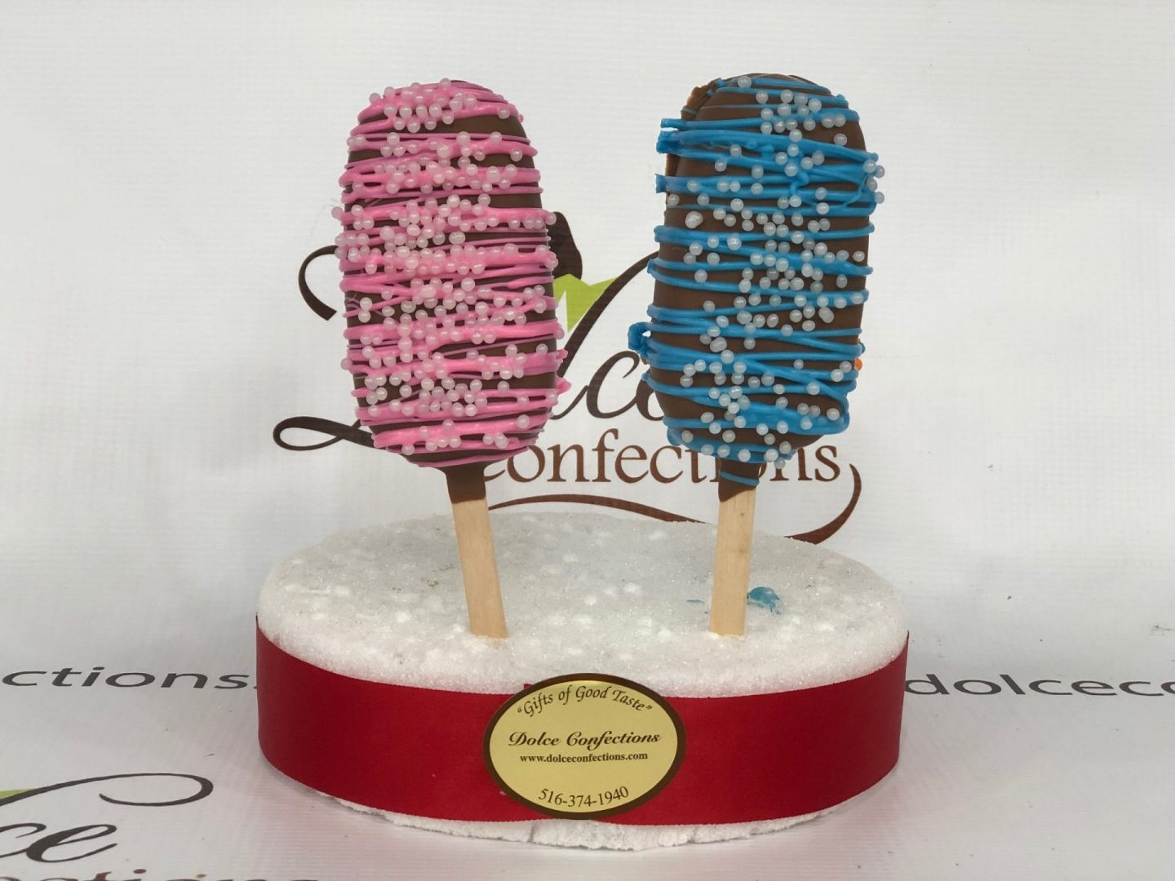 Delicious cake dipped in chocolate and set on a pop stick in baby themed colors. Choose between girl or boy colors.
