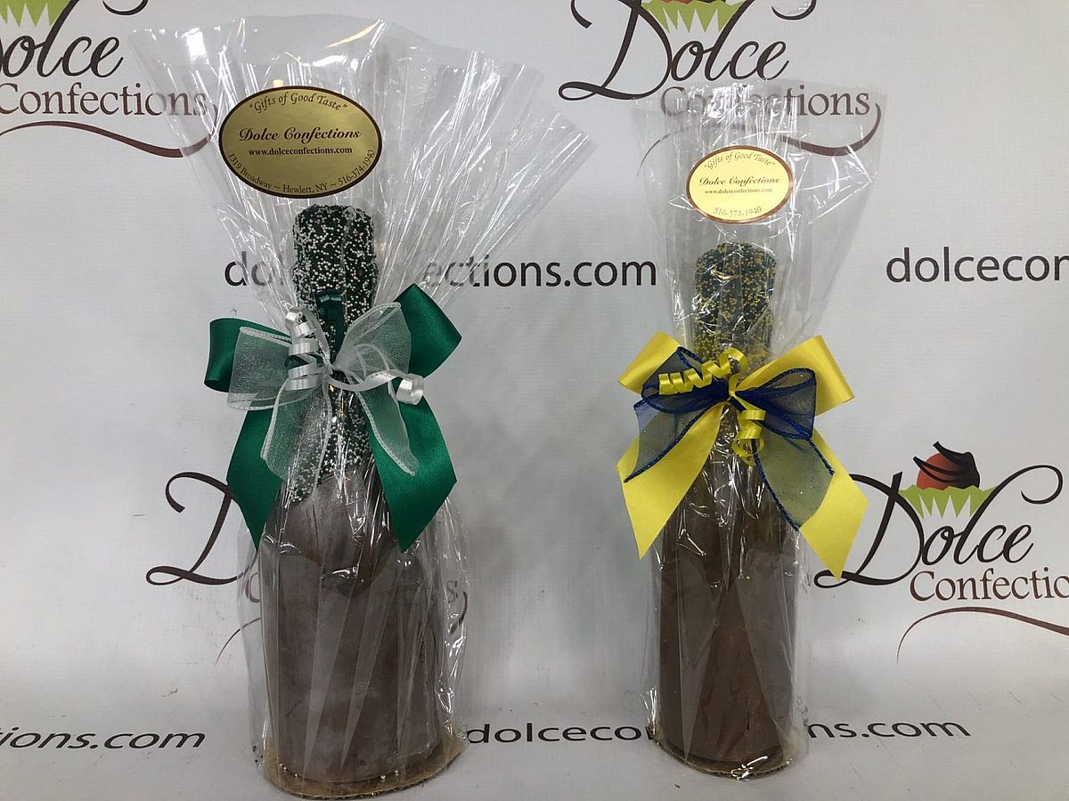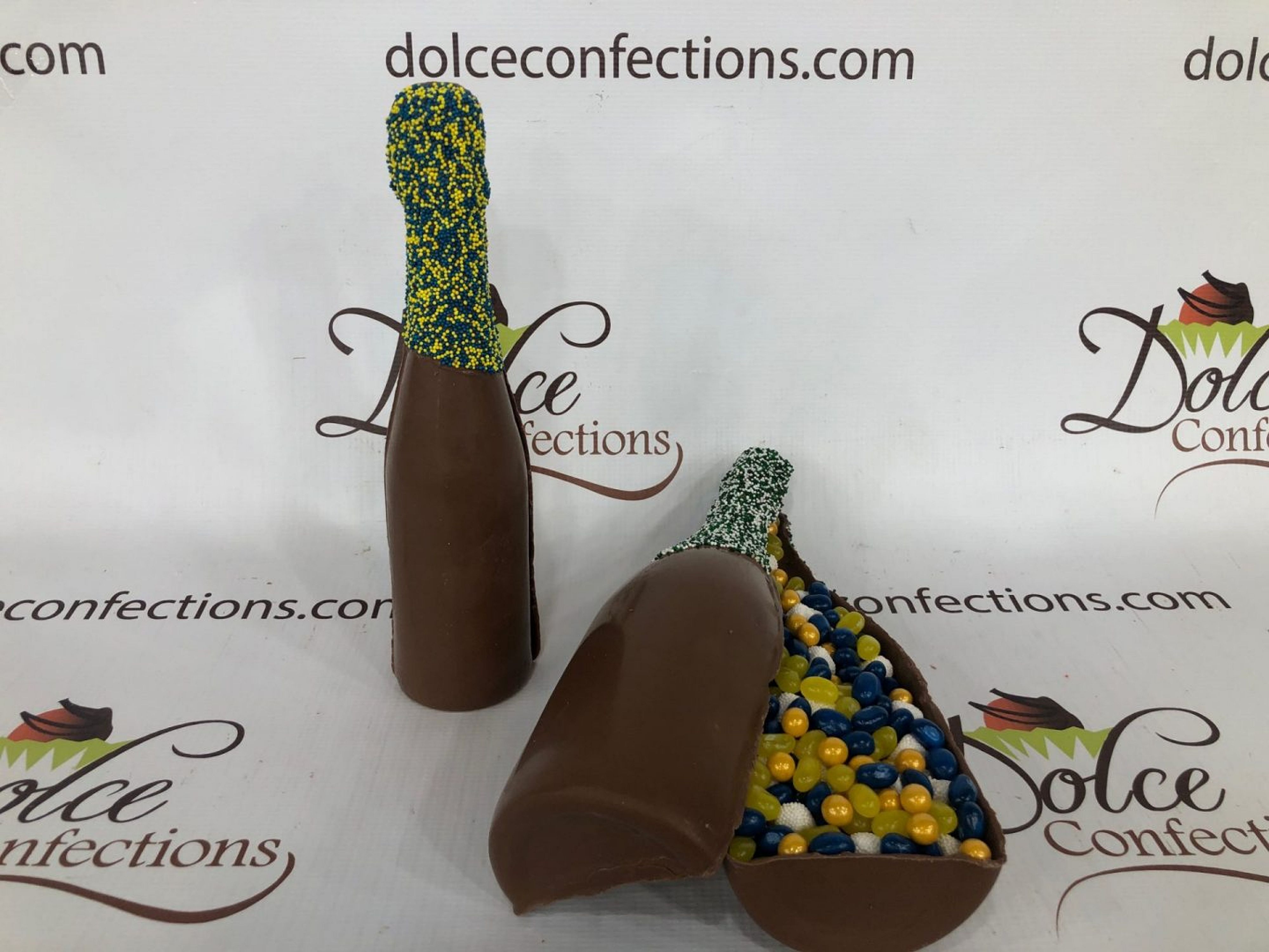 Edible chocolate bottles filled with fun candy and decorated with nonpareils in the colors of specific universities. Bottles available in medium (1o” tall) and large (12″) sizes. Please indicate in the notes the name of the university/college.