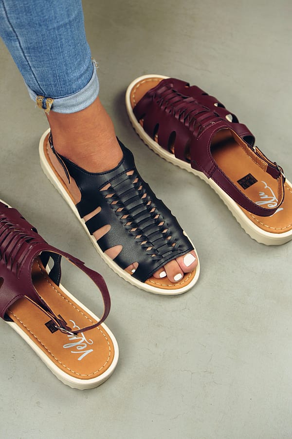 These handcrafted huarache-style sandals feature a woven cactus leather upper with a secure slingback strap for all-day comfort and effortless style. Finished with a cushioned sole and available in classic black and rich wine tones, they’re perfect for casual outings or warm-weather wear.
