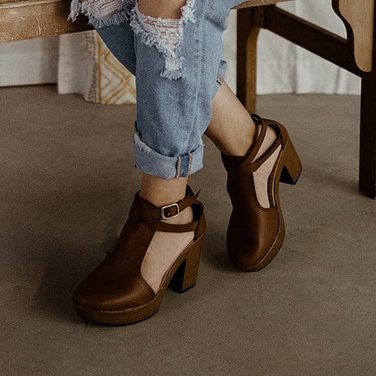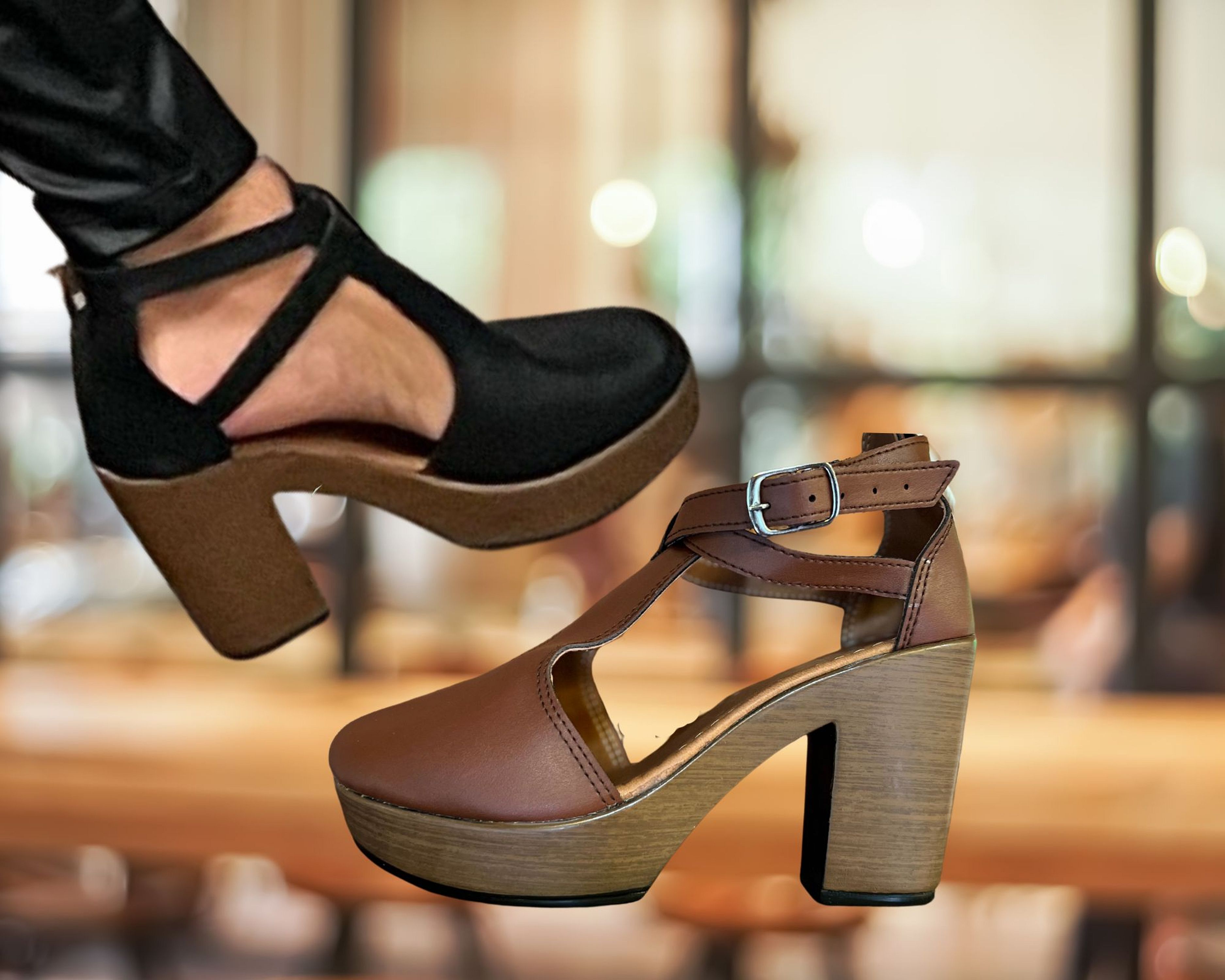 These stylish platform heels feature a smooth cactus leather upper with a flattering T-strap design and an adjustable ankle buckle for a secure fit. Set on a chunky stacked heel and cushioned sole, they offer confident height with all-day comfort.
