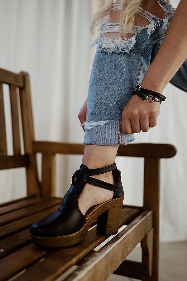 These stylish platform heels feature a smooth cactus leather upper with a flattering T-strap design and an adjustable ankle buckle for a secure fit. Set on a chunky stacked heel and cushioned sole, they offer confident height with all-day comfort.