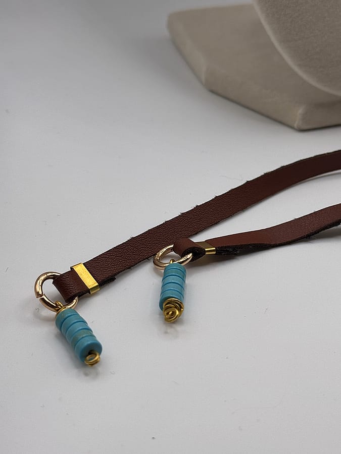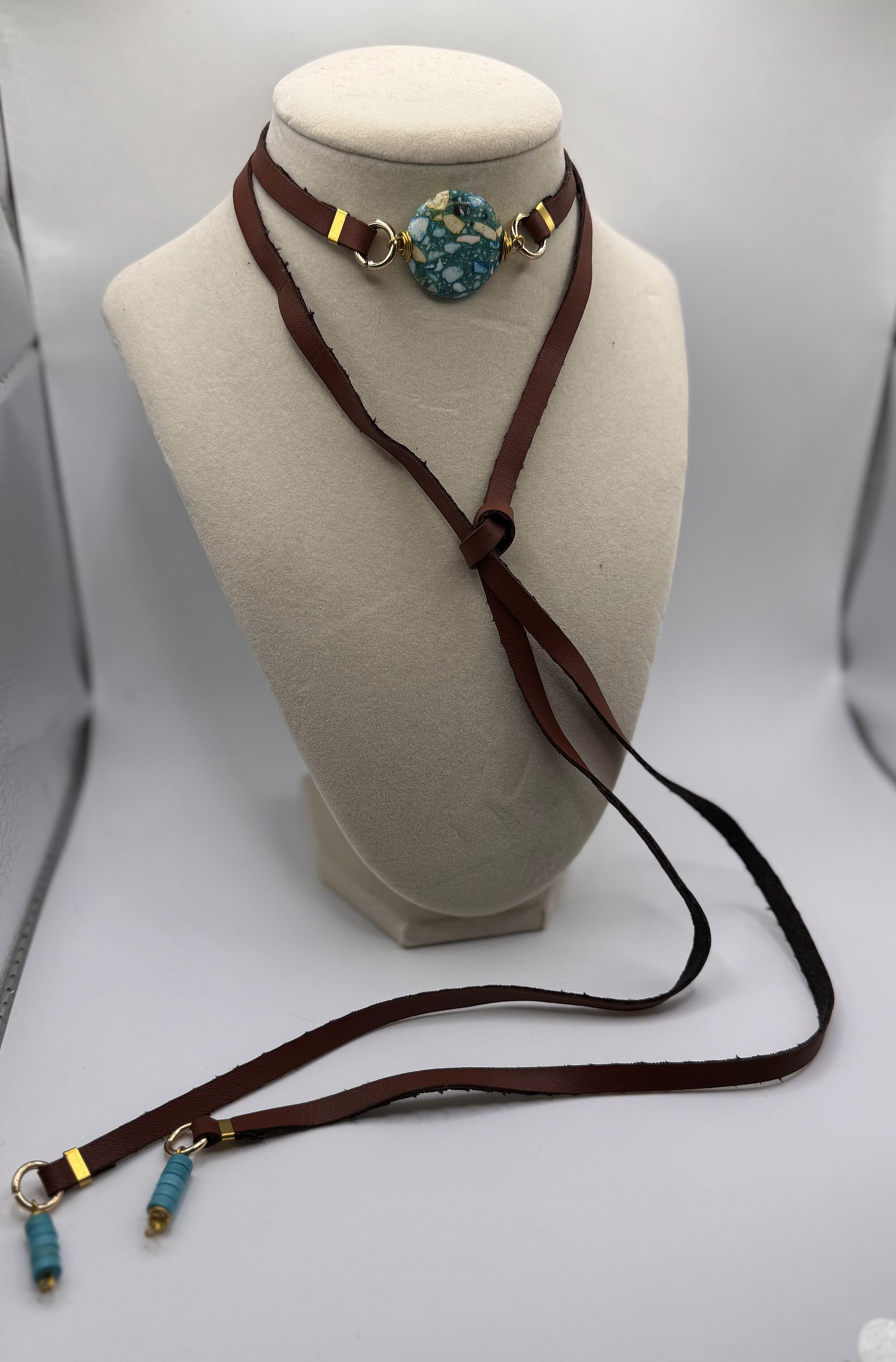 This jasper turquoise stone choker features a rich, earthy stone centerpiece set against a warm brown strap for a naturally grounded look. Effortlessly bohemian yet refined, it adds a subtle pop of color and texture to both casual and dressed-up outfits.