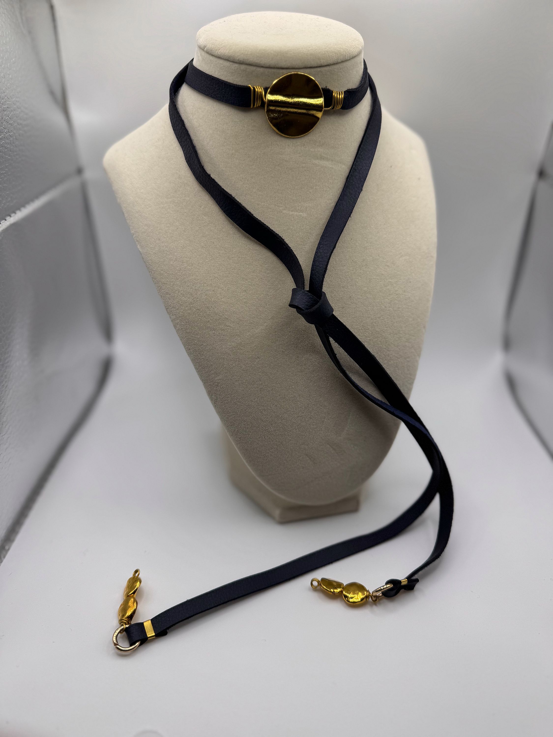 This gold medal choker features a polished metallic centerpiece paired with a bold blue strap for a striking contrast. Modern yet timeless, it adds a refined statement to both casual and elevated looks.