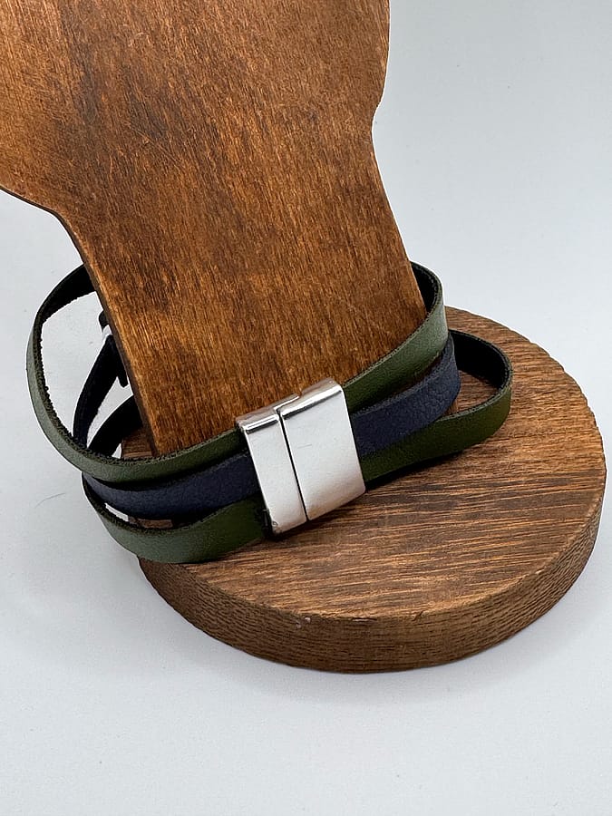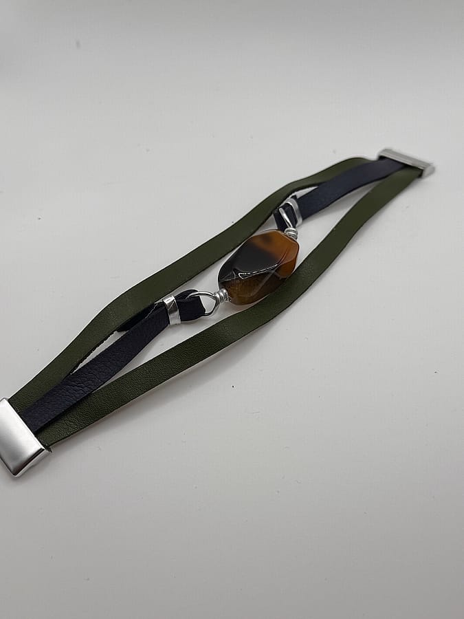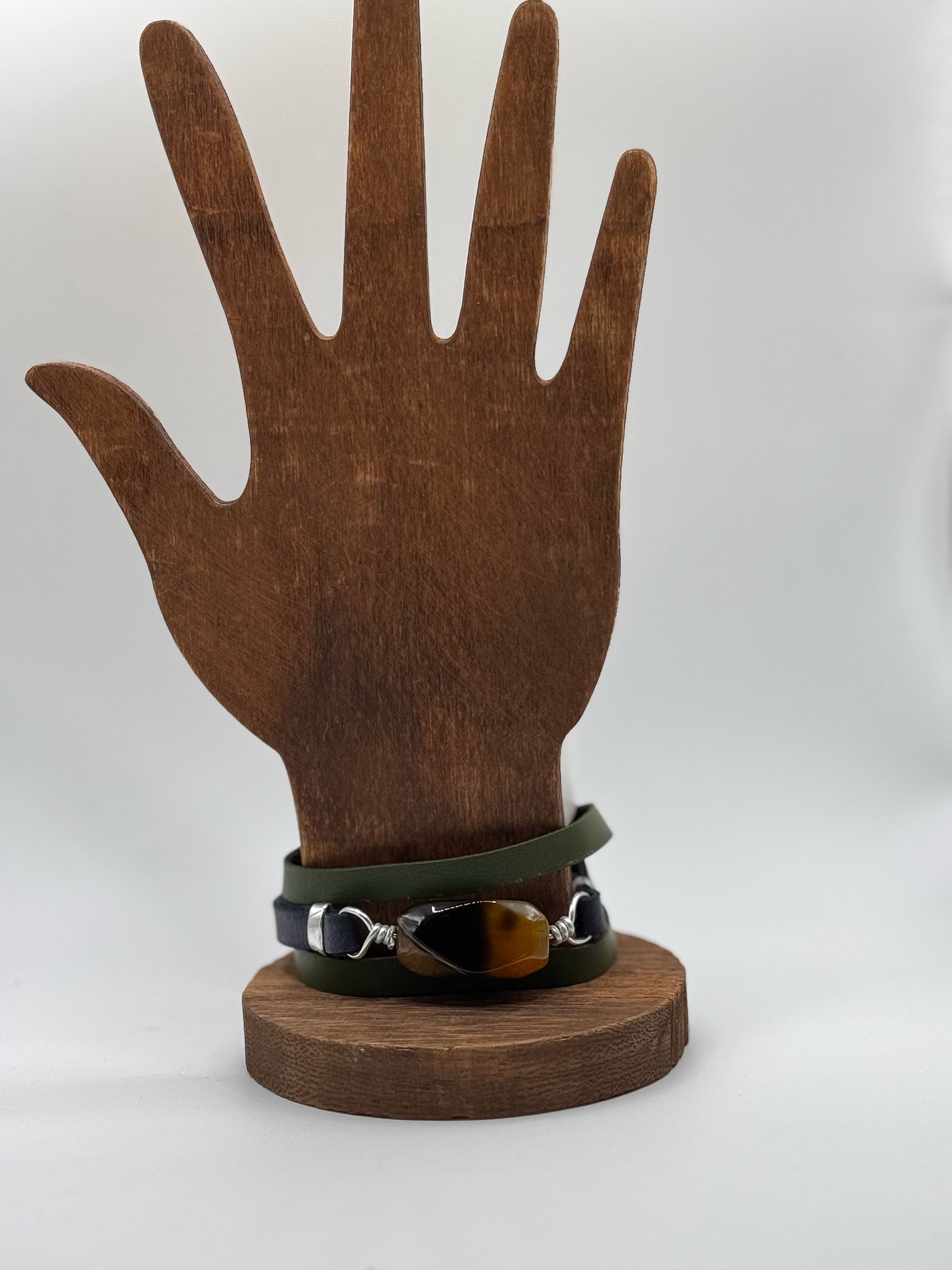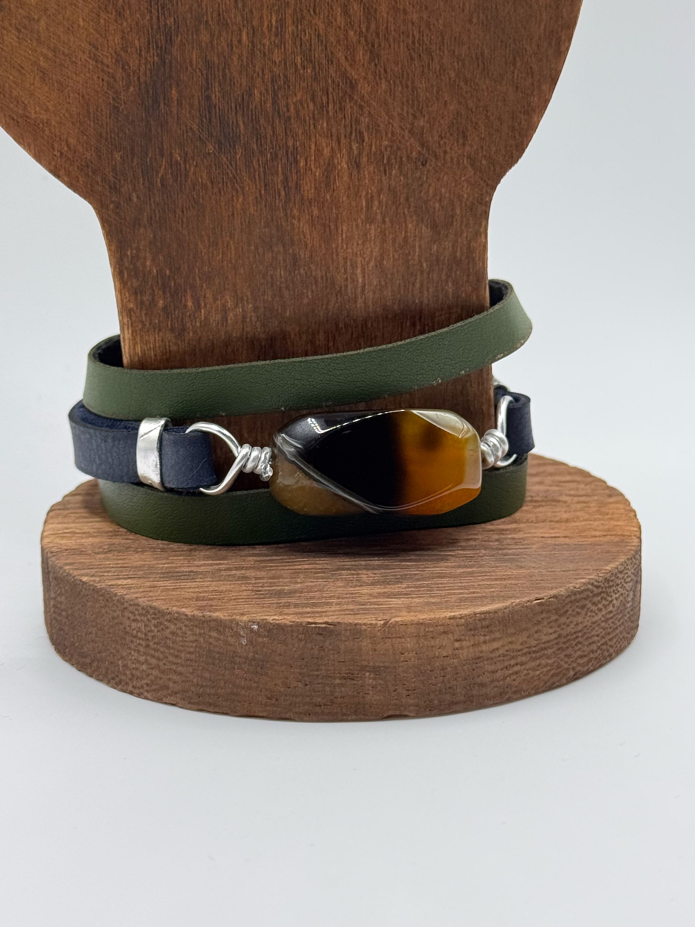 This yellow and black stone bracelet showcases bold natural stones paired with a vibrant green and blue strap for a striking contrast. Unique and expressive, it adds a pop of color and earthy texture to any casual or statement look.