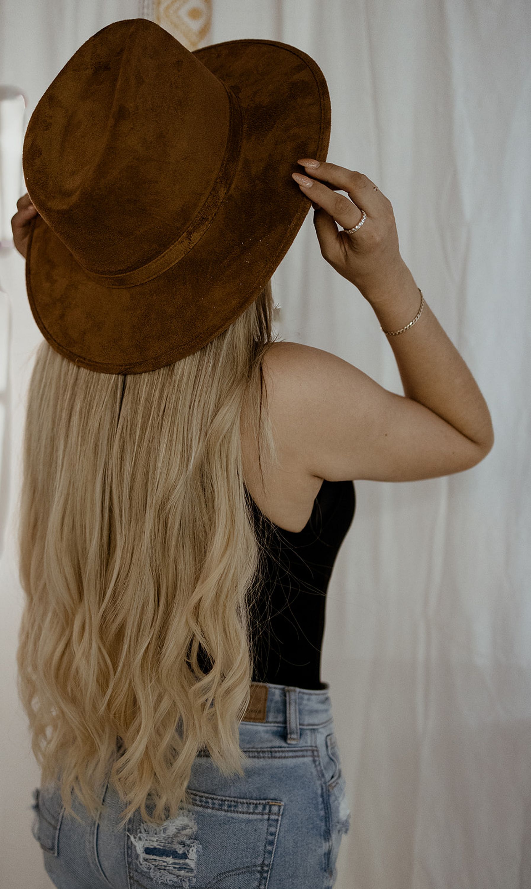 This brown hat exudes timeless elegance with a modern edge. Its structured design and classic silhouette make it a versatile accessory for both casual and formal looks. Size Large