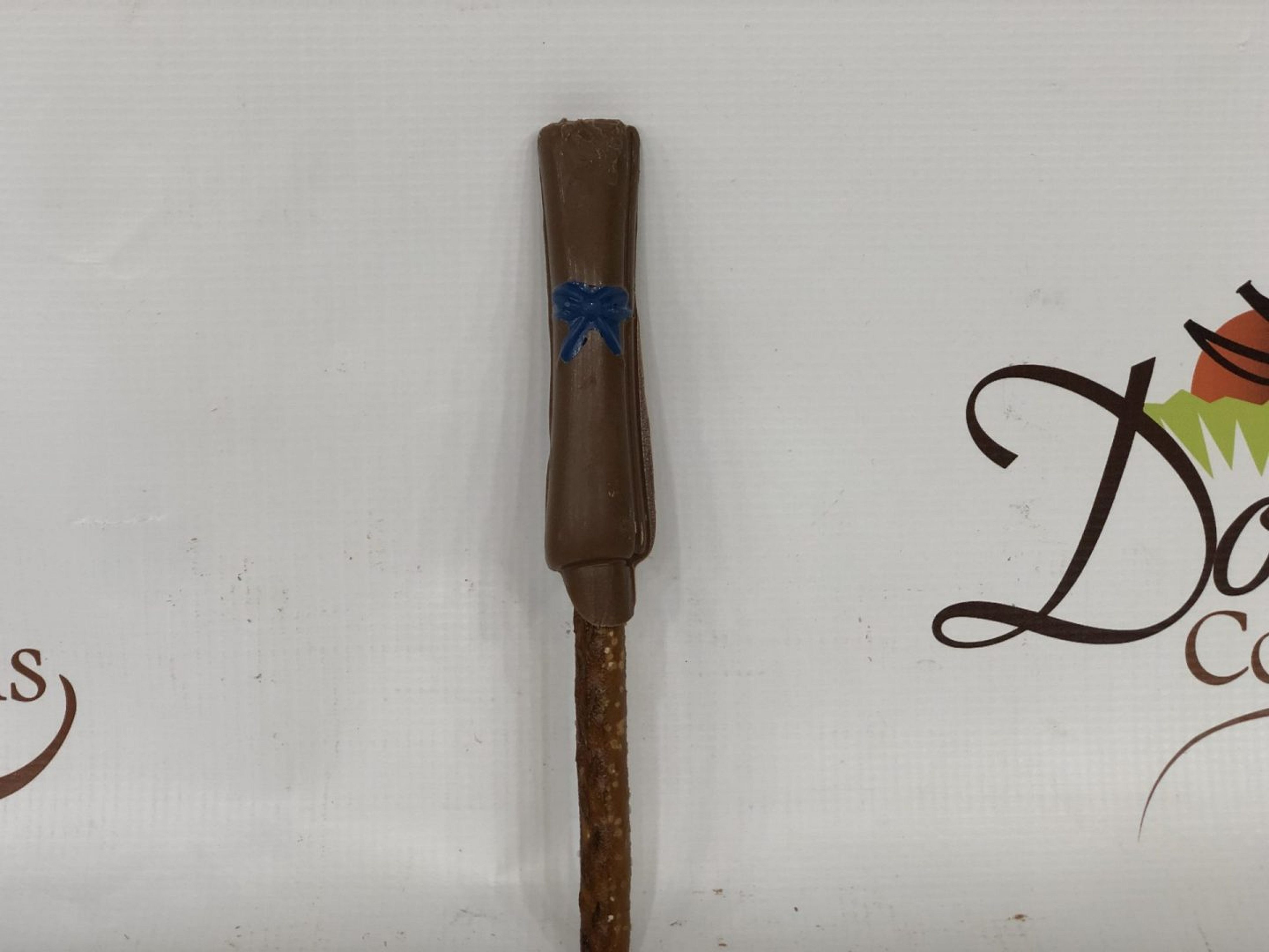 Pretzel rods dipped in milk or dark chocolate and shaped like a diploma.