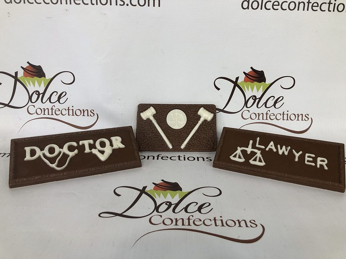 Chocolate molds to celebrate the graduation of your aspiring doctor or lawyers. Choose from a choice of: 7″ x 3″ chocolate bar with the words “Doctor” or “Lawyer” 6″ x 3.75″ plaque with a scale and gavels. Available in milk or dark chocolate.