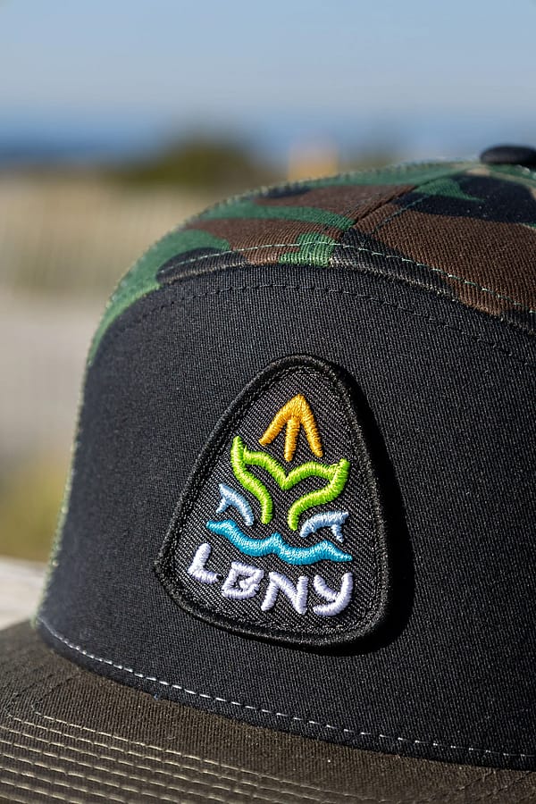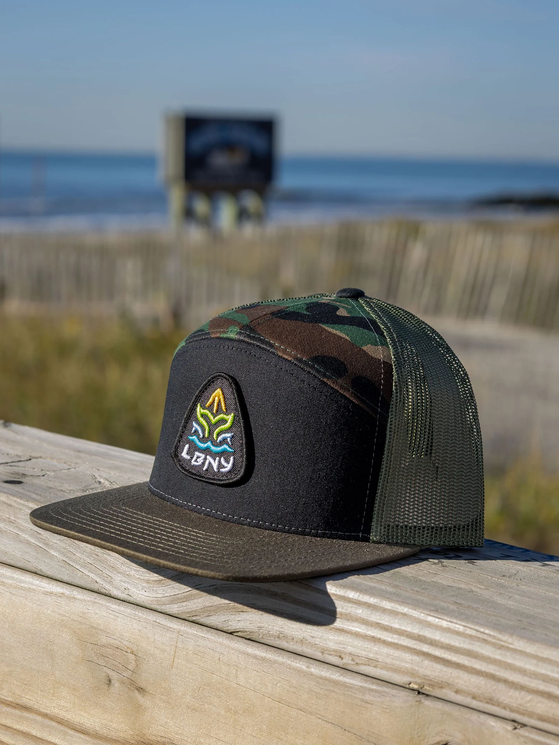 7-Panel Trucker Snapback. Flat bill. Twill front. Mesh back. Locally hand-sewn Apex Vital Patch. LB Wave logo embroidery on the left side.