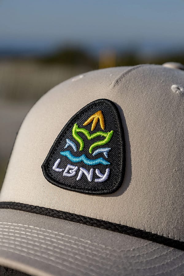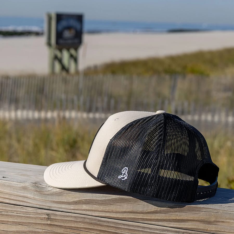 5-Panel Trucker Snapback. Curved bill. Twill front. Mesh back. Locally hand-sewn Apex Vital Patch. LB Wave logo embroidery on the left side.