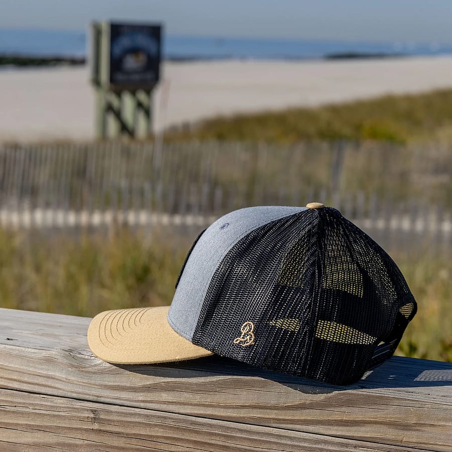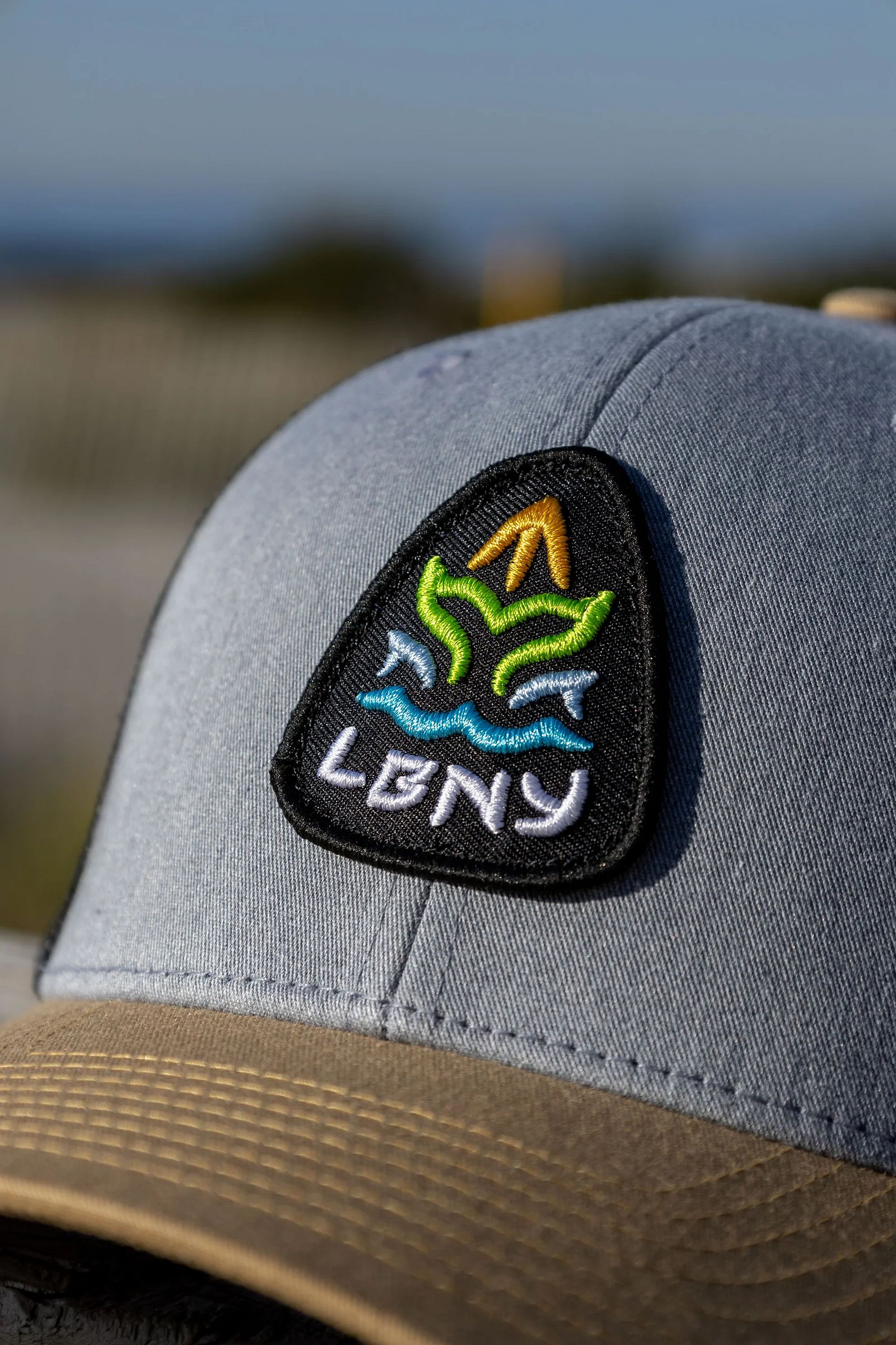 6-Panel Trucker Snapback. Curved bill. Twill front. Mesh back. Locally hand-sewn Apex Vital Patch. LB Wave logo embroidery on the left side.
