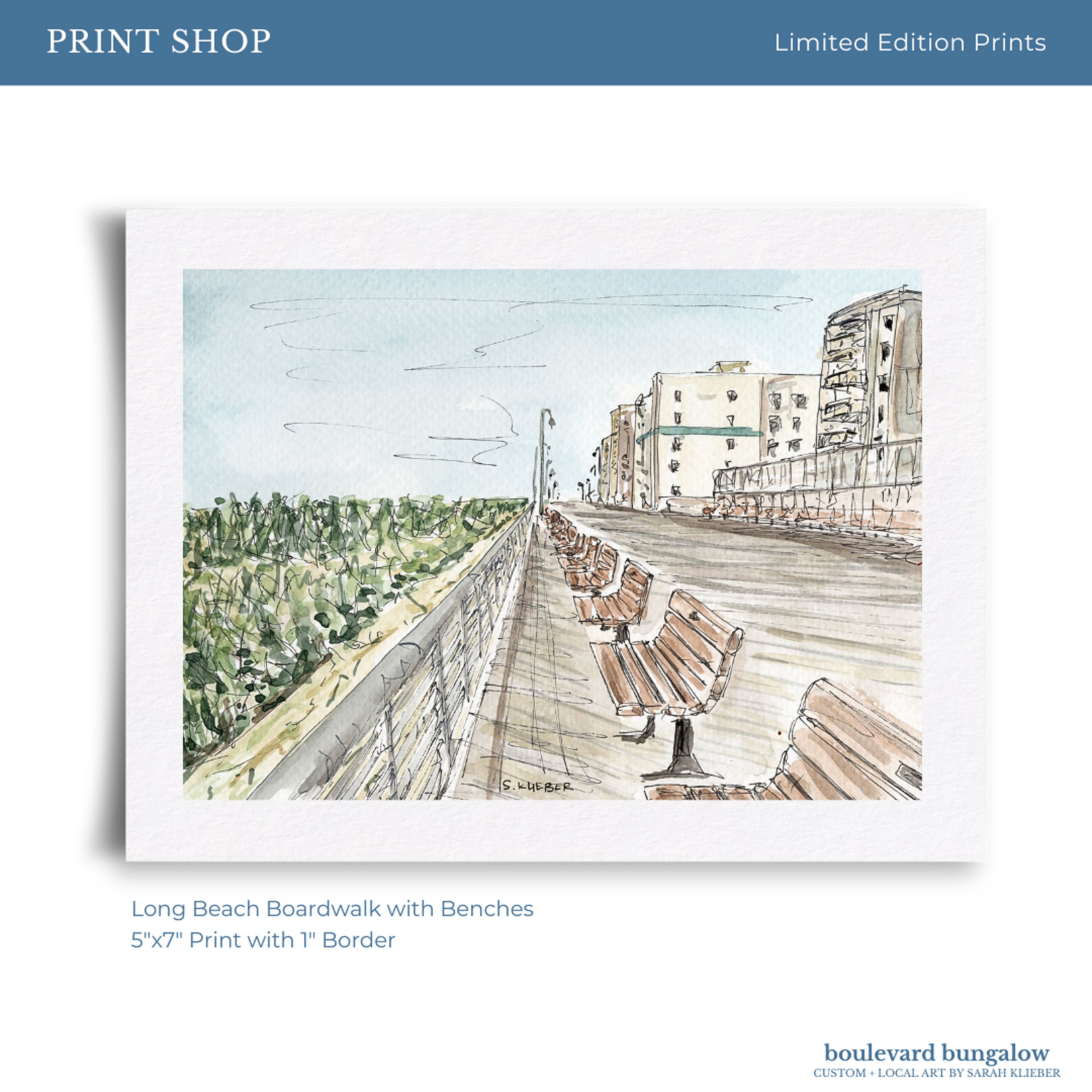 Capture the relaxed rhythm of Long Beach with this boardwalk scene lined with benches and ocean views.