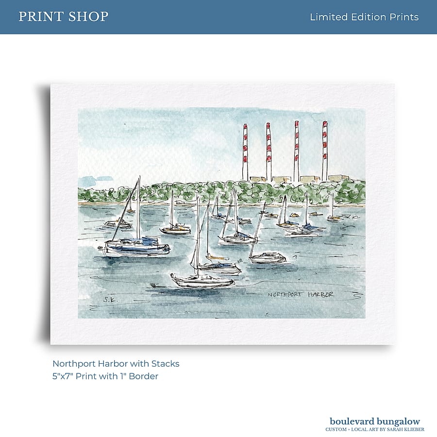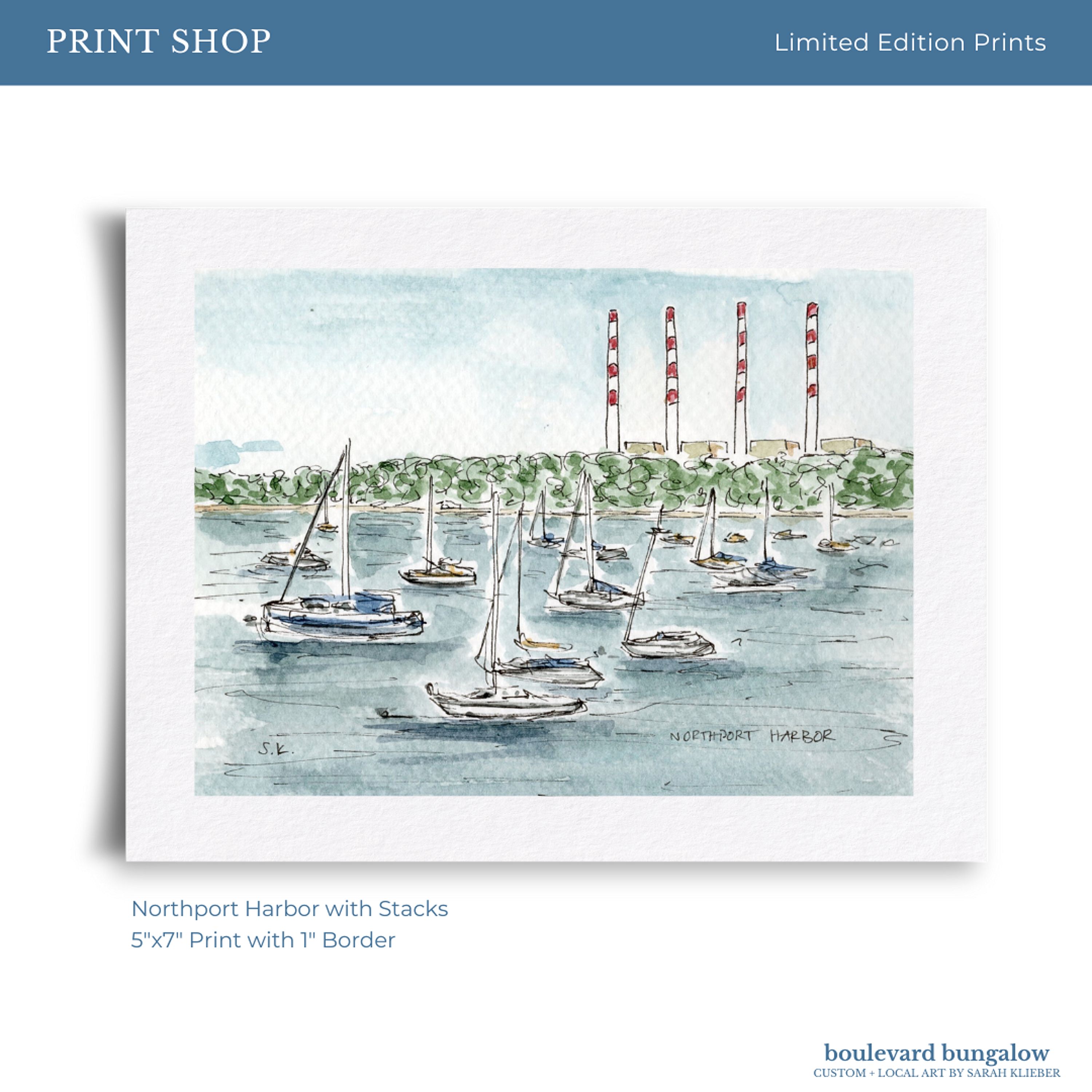 A signature Northport scene highlighting the classic harbor stacks and waterfront charm.