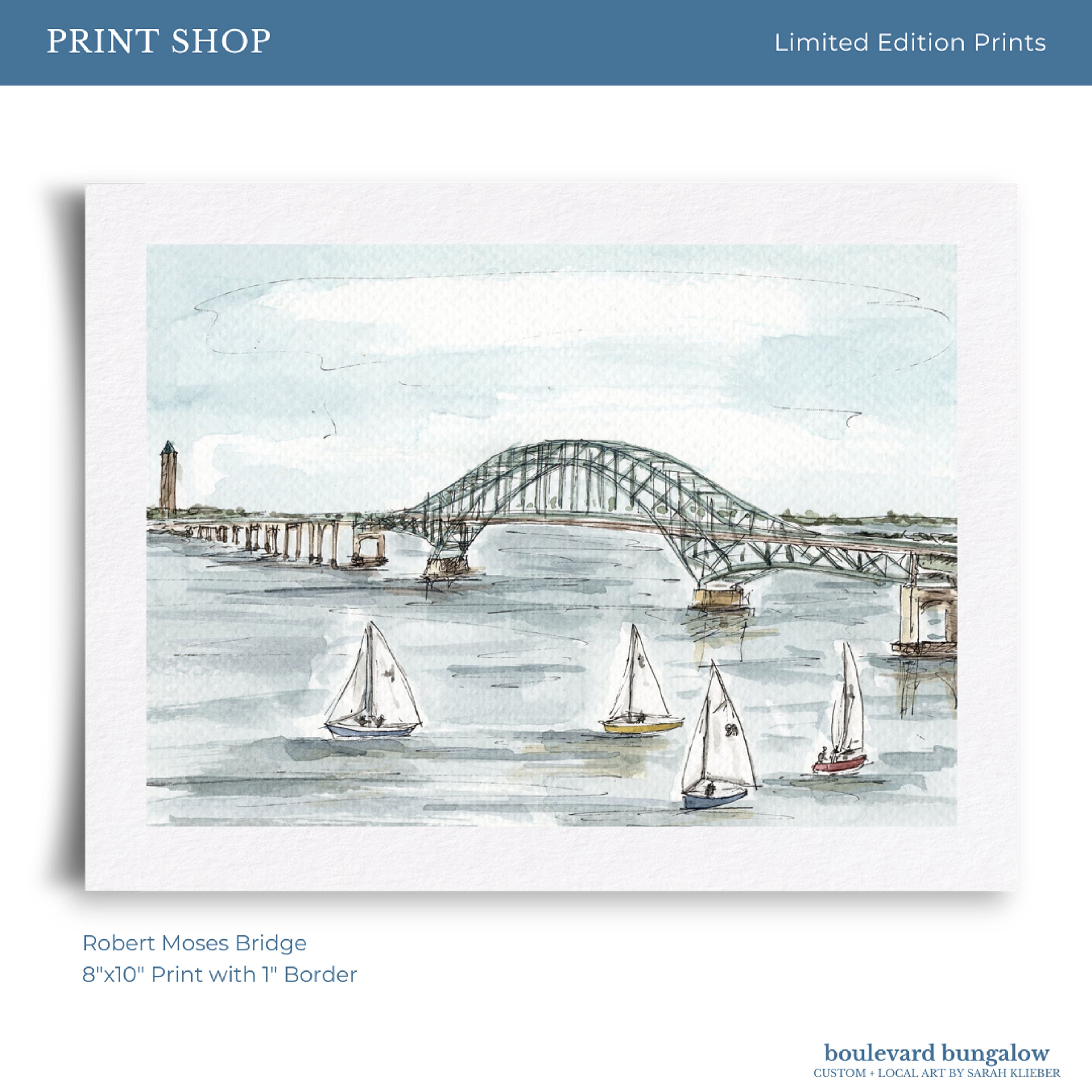 A striking view of the Robert Moses Bridge, capturing its clean lines and coastal setting as it spans the waters near Fire Island.