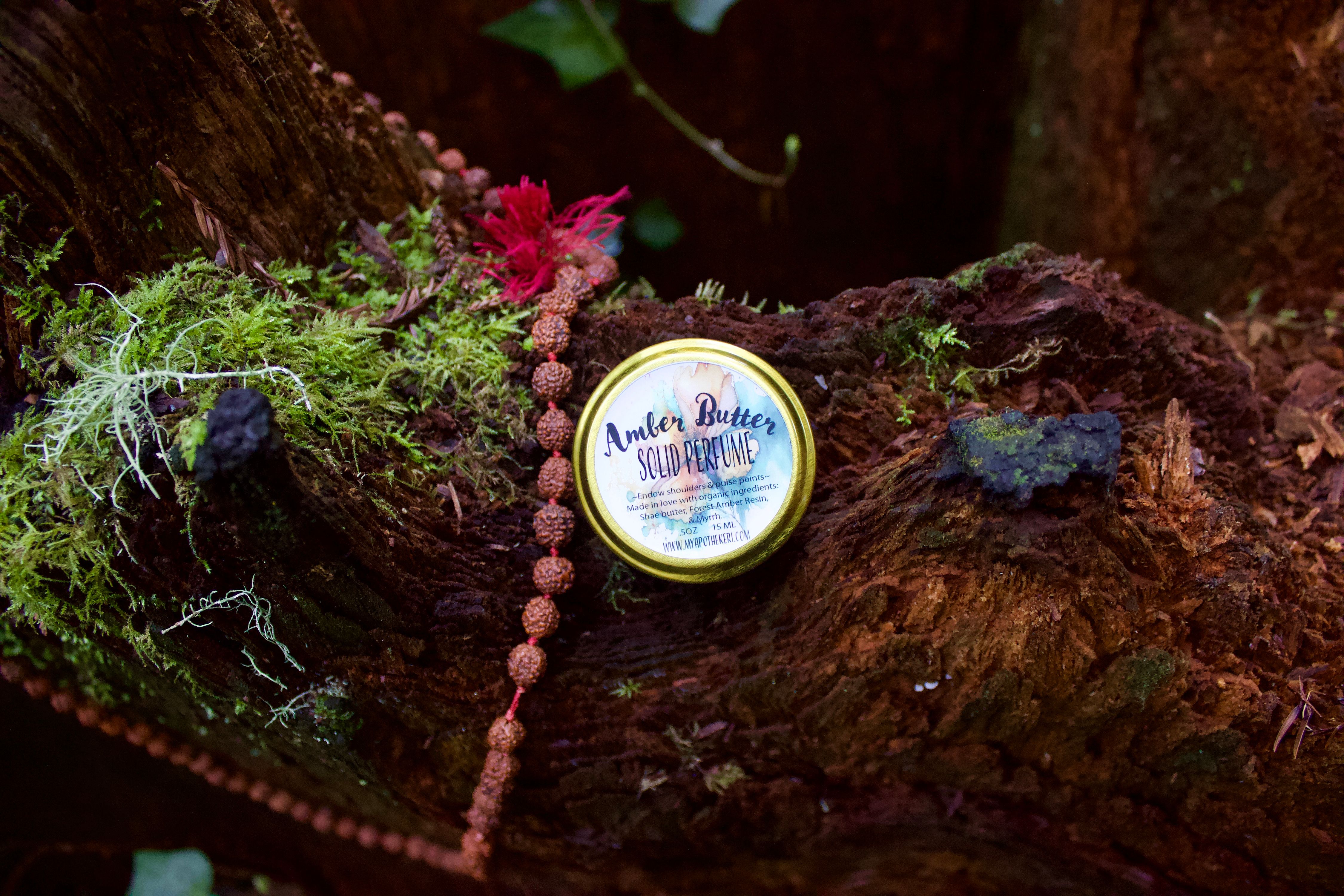 Made in love with all organic ingredients: Amber resin (proprietary blend of various resins such as styrax or benzoin, gums, & oleoresins, vanilla, & beeswax), Shea butter, & Myrrh