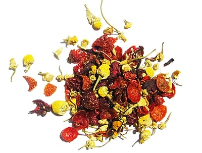 An excellent and relaxing tea! Chamomile has long been known to help with sleep or calm an upset stomach. Complemented by the vibrant notes of rosehips and hibiscus flowers, this infusion offers a refreshing combination of sweetness with a subtle tartness. Not to mention hibiscus' and rosehips' plethora of proposed health benefits. Try over ice for an amazing iced tea experience. Embark on a journey of relaxation and rejuvenation with every sip. Steep 1 teaspoon for 3 minutes per 8 ounces of boiled water. Ingredients: Rosehips*, hibiscus*, chamomile*, rooibos*, & non-GMO natural flavor (*organic)