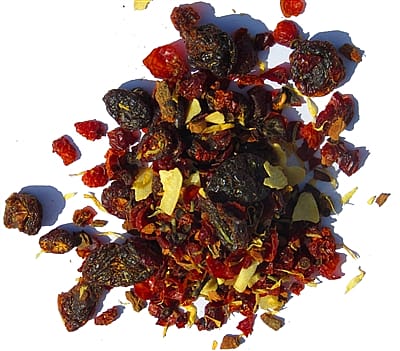 Ingredients: Rosehips*, dried cherries*, cinnamon*, dried coconut*, non-GMO natural flavor, & calendula flowers* (*organic)