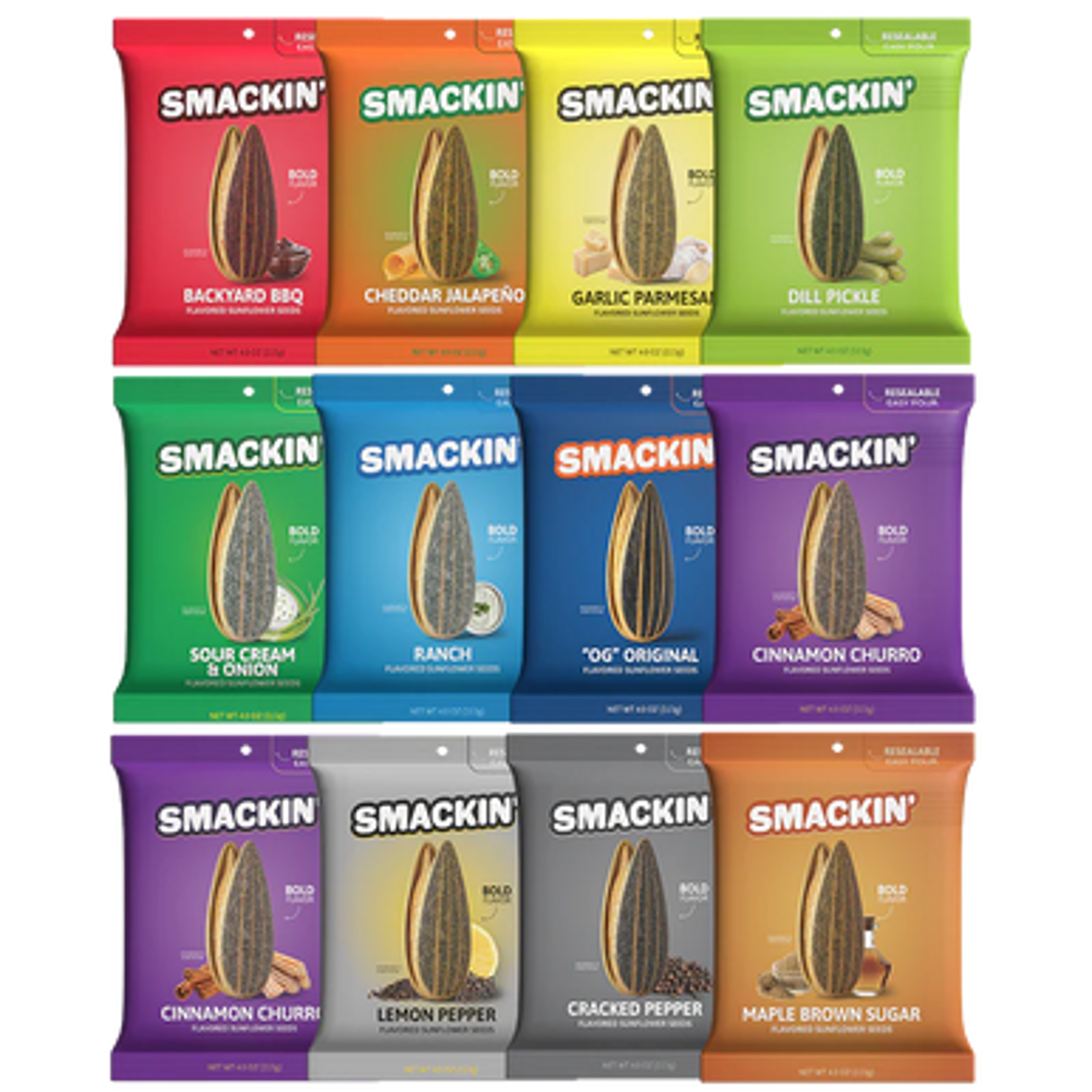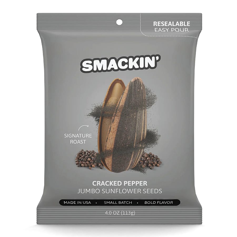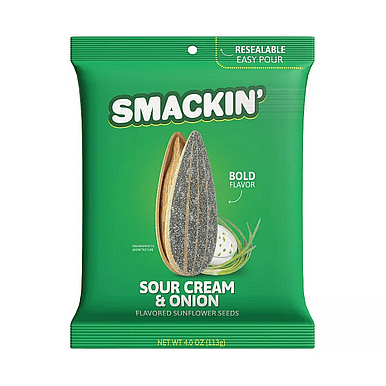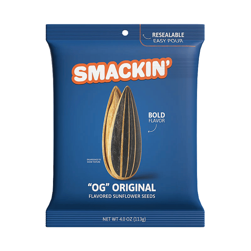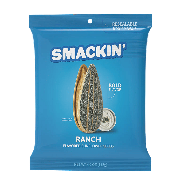 Snack hard with Smackin' Sunflower Seeds in bold, crackable 4oz bags. These in-shell roasted seeds are packed with unforgettable flavor and the perfect crunch. Each bag is sold separately, giving you the freedom to choose your go-to favorites or mix it up every time. Ideal for dugouts, desk drawers, glove compartments, or any on-the-go craving, these 4oz bags bring the fuel and the flavor. Available Flavors (4oz bags, each sold separately): OG Original. Maple Brown Sugar. Garlic Parmesan. Cheddar Jalapeno. Ranch. Backyard BBQ. Cinnamon Churro. Cracked Pepper. Dill Pickle. Sour Cream.