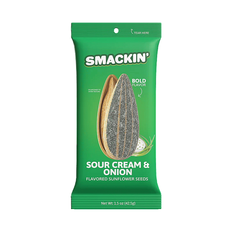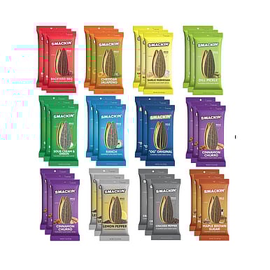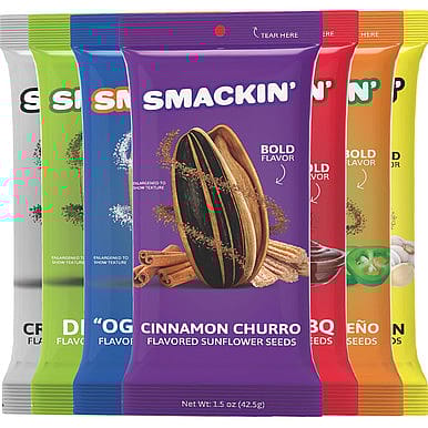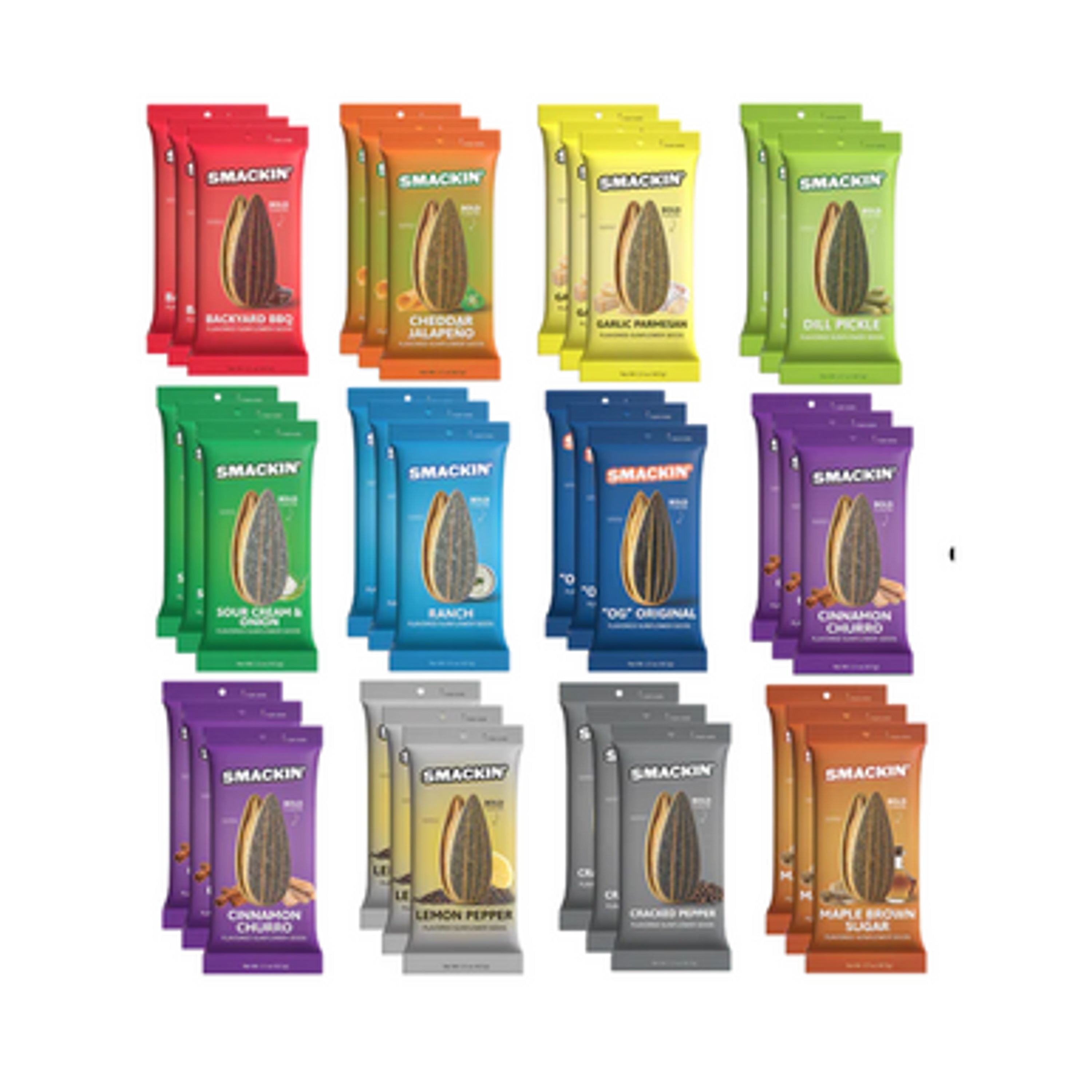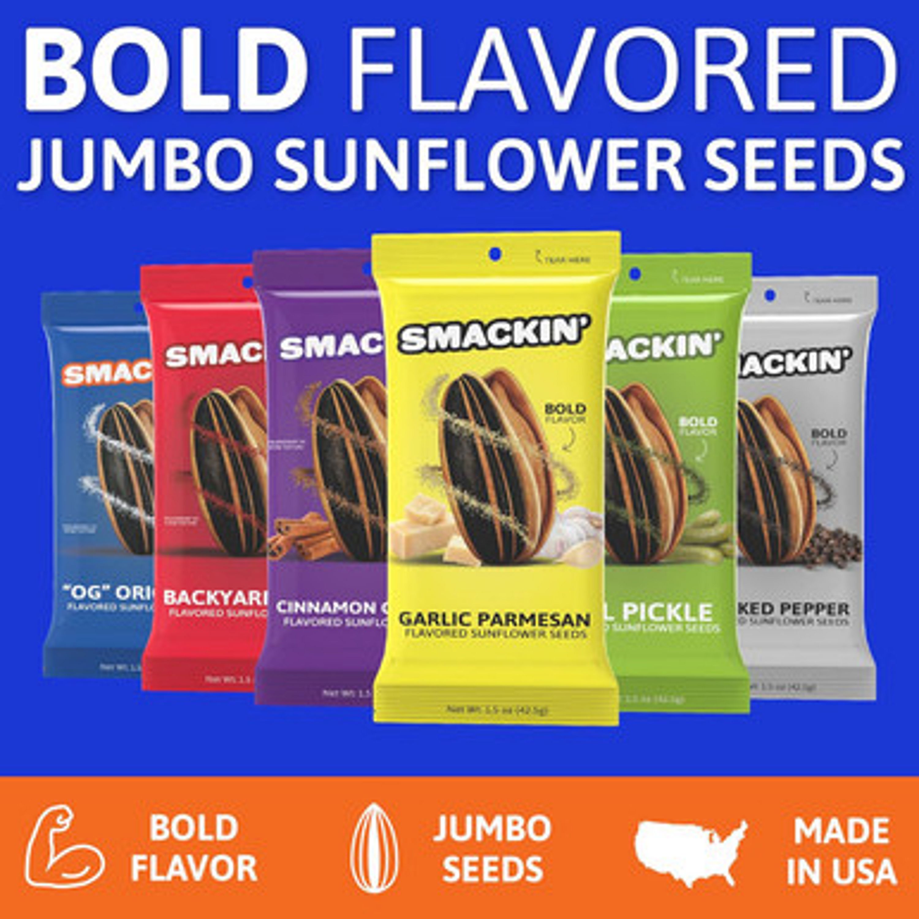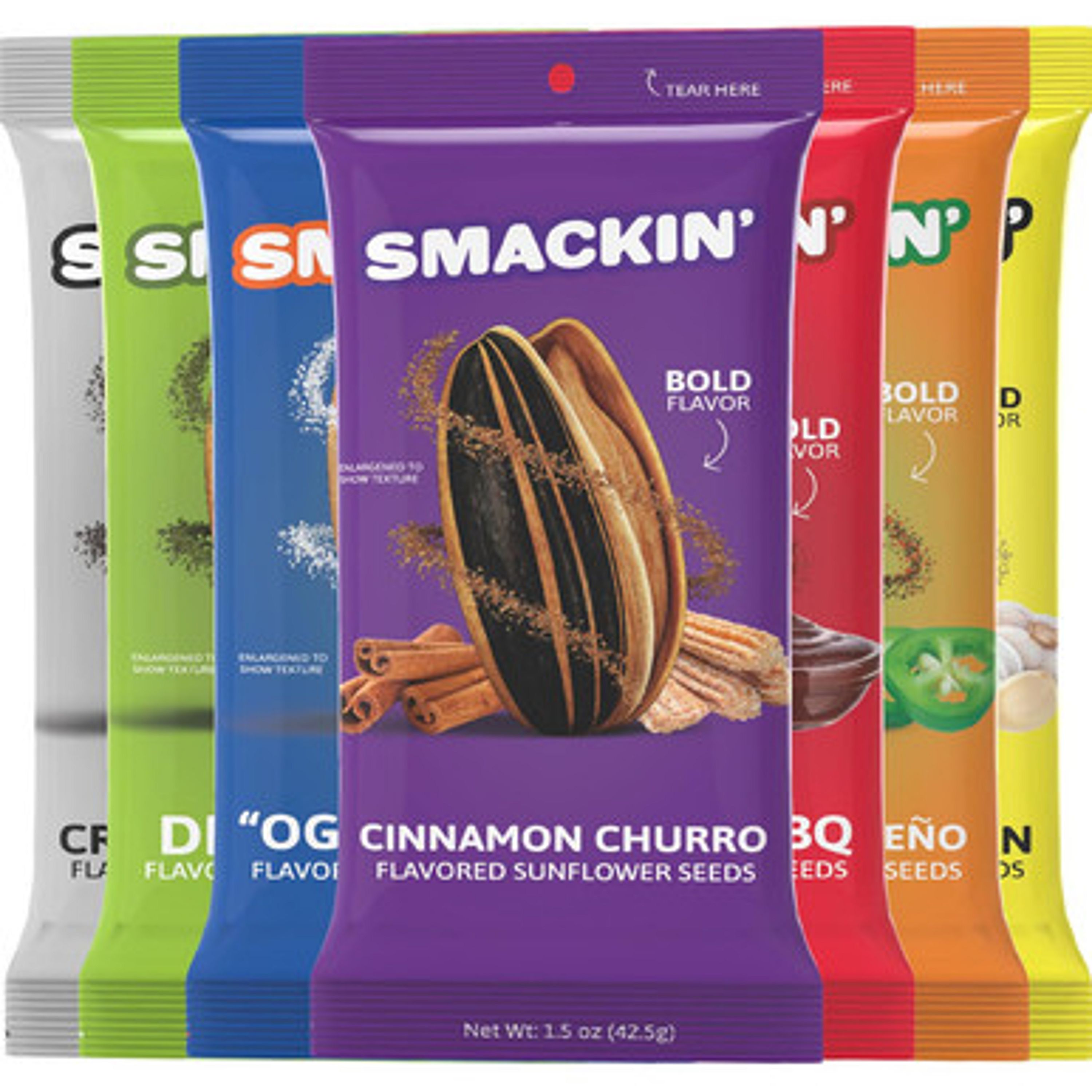 Smackin' Sunflower Seeds deliver bold, creative flavor in every crunchy, in-shell bite. Each 1. 5oz bag is sold individually, so you can mix and match your favorite flavors or try something new with every order. Whether you're into sweet, spicy, savory, or wild, there's a Smackin' flavor that'll keep your snack game strong. Perfect for athletes, game days, road trips, or everyday munching, these seeds bring big taste in a perfectly portioned pack. Available Flavors (each sold separately, 1. 5oz bags): Ranch. Cracked Pepper. Garlic Parmesan. Cheddar Jalapeno. Dill Pickle. Churro. BBQ. OG (Original). Bacon. Cinnamon Roll. Pizza. Maple Brown Sugar. Guac. Salsa. Taco. Lemon Pepper.
