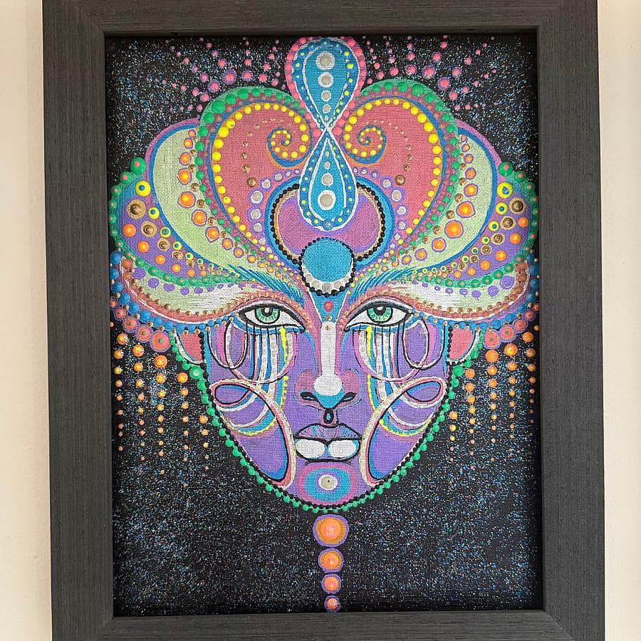 ET (Elena Telford) is a visionary artist based in San Francisco. Her unique, captivating art explores mysticism, spirituality, themes of creation, healing, growth and eternal absolute. Most of her paintings include and represent different dimensions: Physical (daylight), Mental (colors/black light), Absolute (darkness). Channeled in a state of trance, ET’s works serve as both a window and a bridge between worlds.   Products Details: Painting Size 9'' x 12'' Frame Size 11'' x 14'' Acrylic, Chrome Markers 3d UV Reactive / Glow in the dark Paint on Canvas