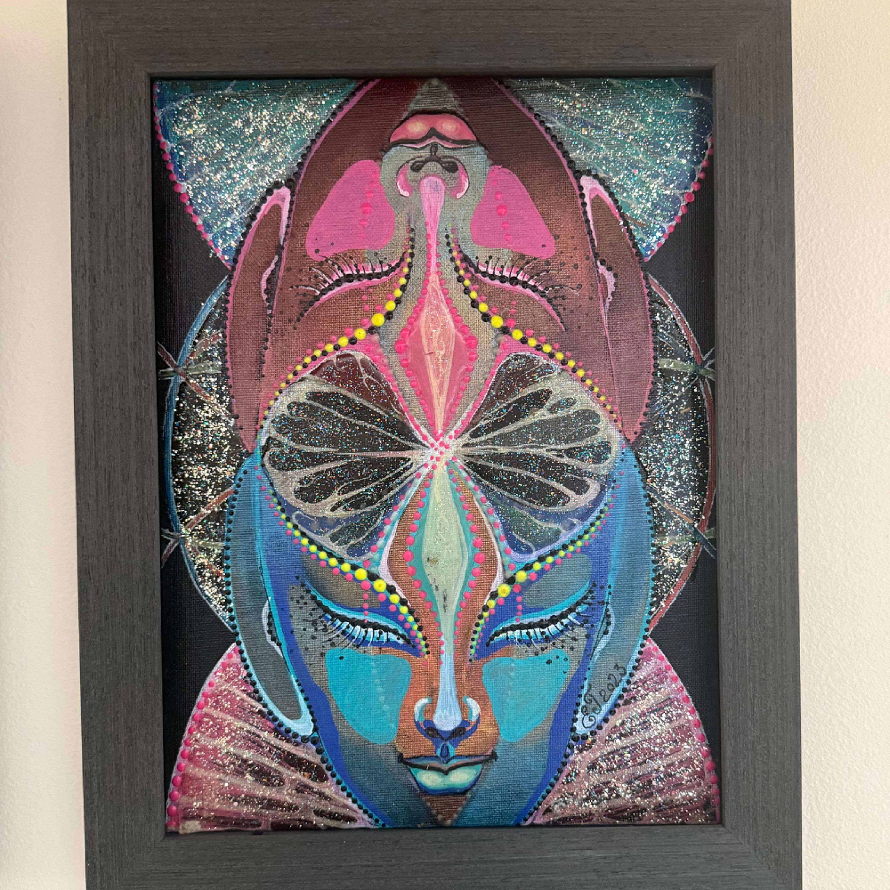 ET (Elena Telford) is a visionary artist based in San Francisco. Her unique, captivating art explores mysticism, spirituality, themes of creation, healing, growth and eternal absolute. Most of her paintings include and represent different dimensions: Physical (daylight), Mental (colors/black light), Absolute (darkness). Channeled in a state of trance, ET’s works serve as both a window and a bridge between worlds.   Products Details: Painting Size 9'' x 12'' Frame Size 11'' x 14'' Acrylic, Chrome Markers 3d UV Reactive / Glow in the dark Paint on Canvas